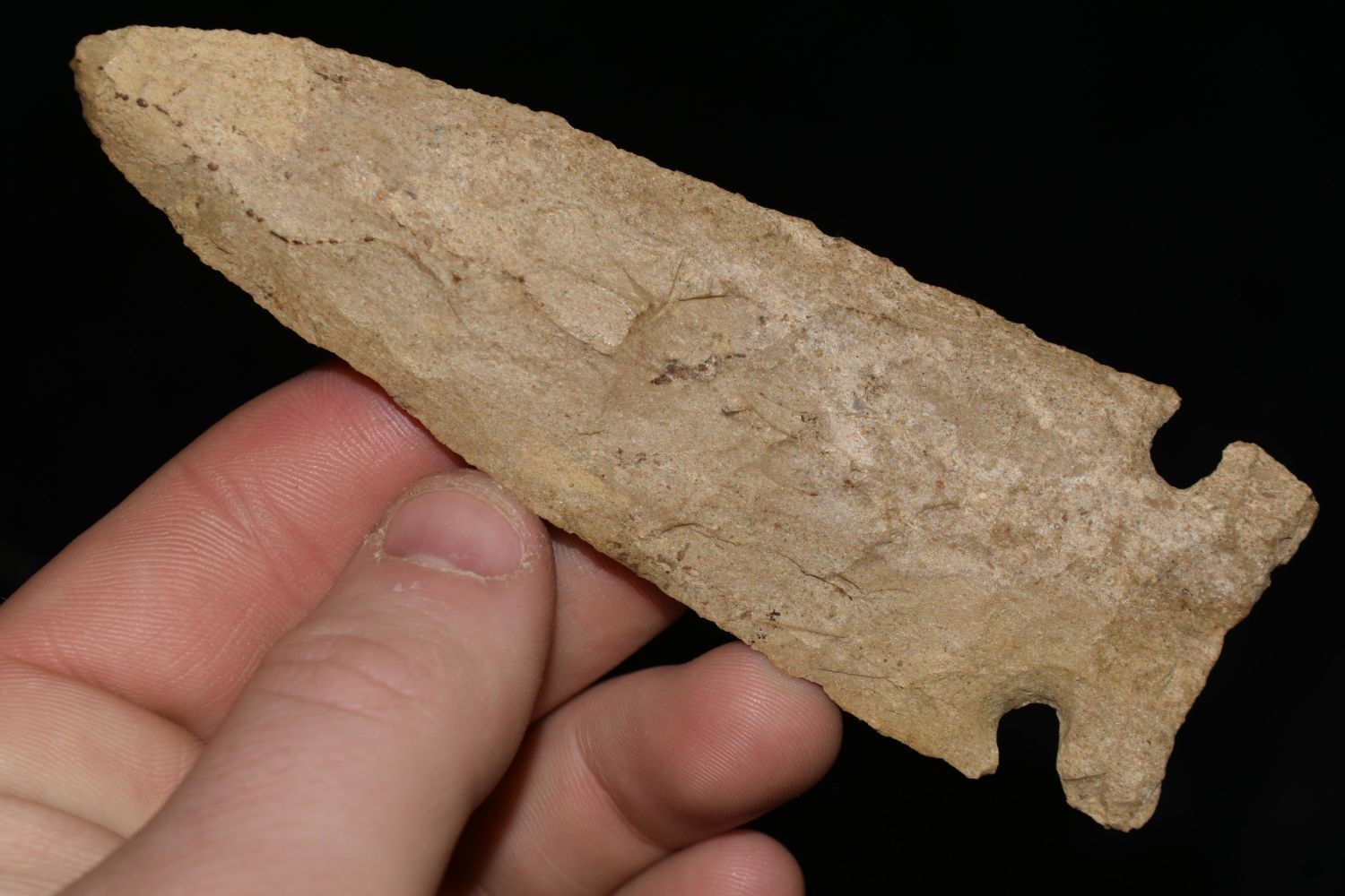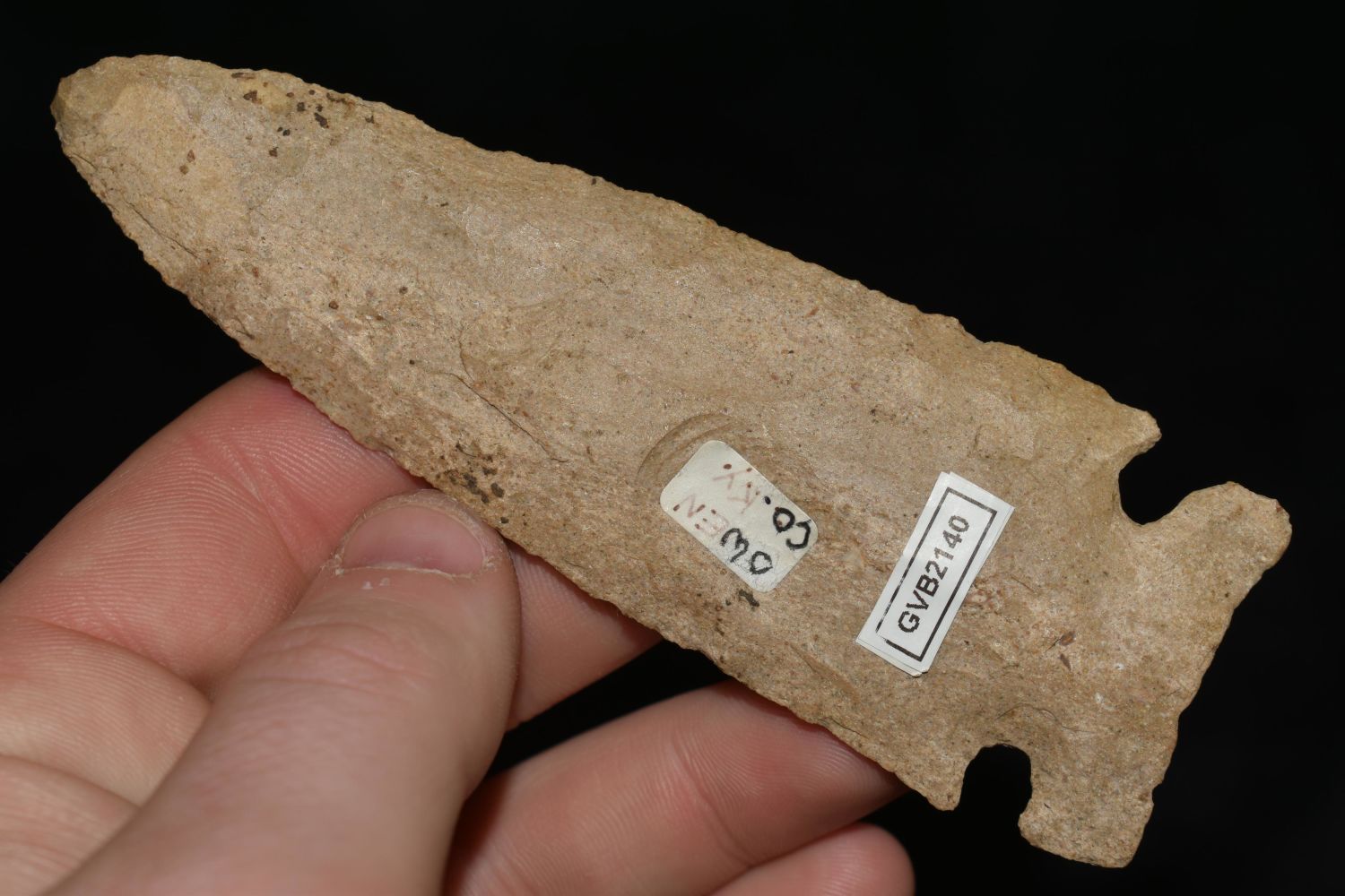 4 1/2" Side Notched, Archaic Point from Owen Town Kentucky, Restoration to Top Ear, Native American Artifact