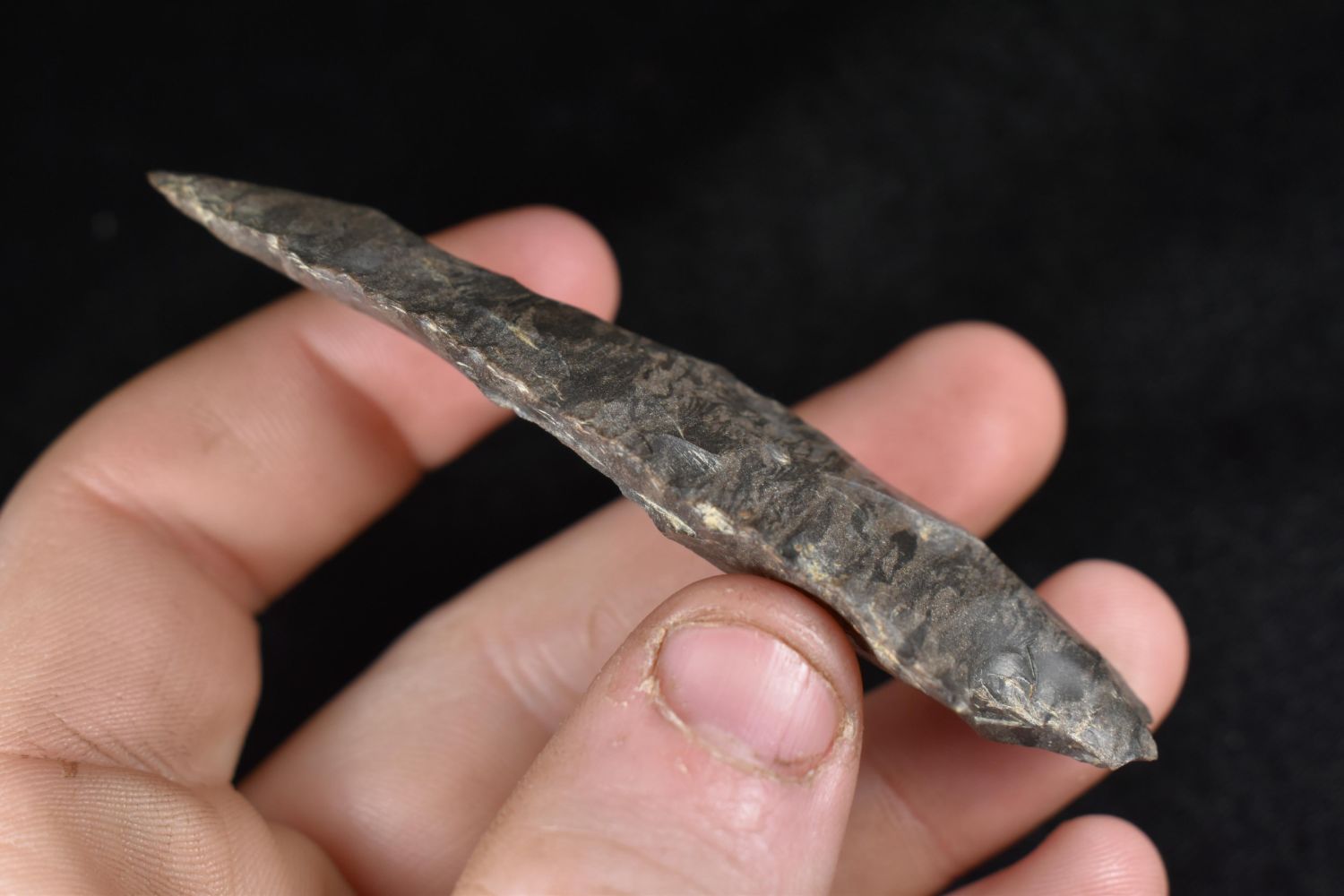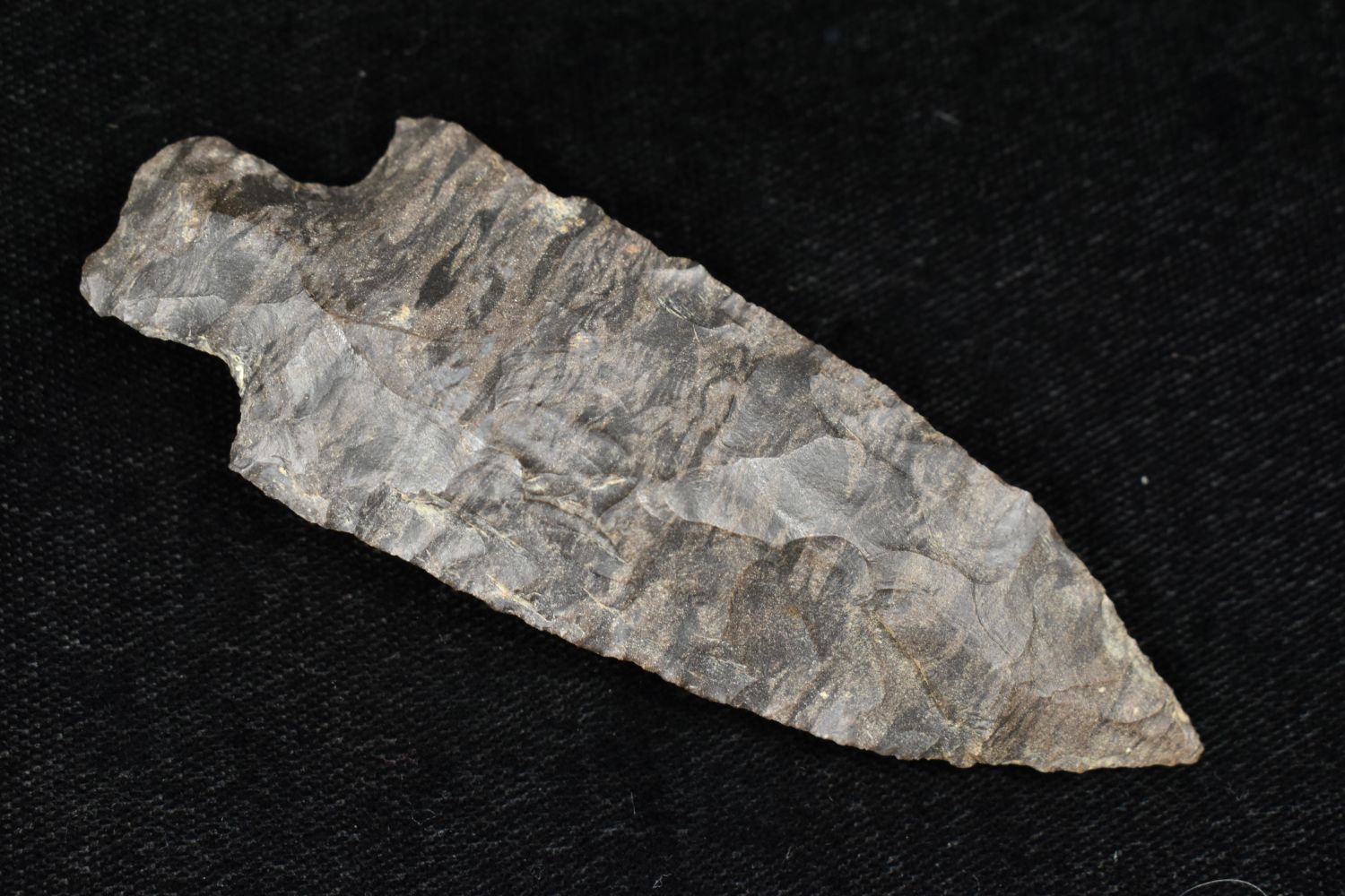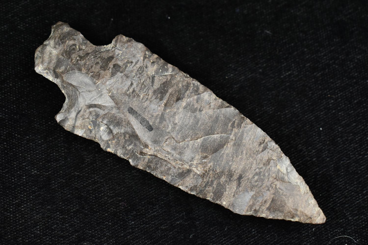 3 3/8" COLORFUL DOVER MOTLEY FOUND IN BENTON/HUMPHREYS COUNTY TENNESSEE, EX SIMMS COLLECTION, NATIVE AMERICAN INDIAN ARROWHEAD, ARTIFACT