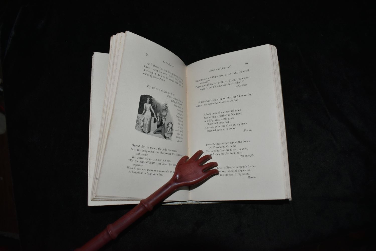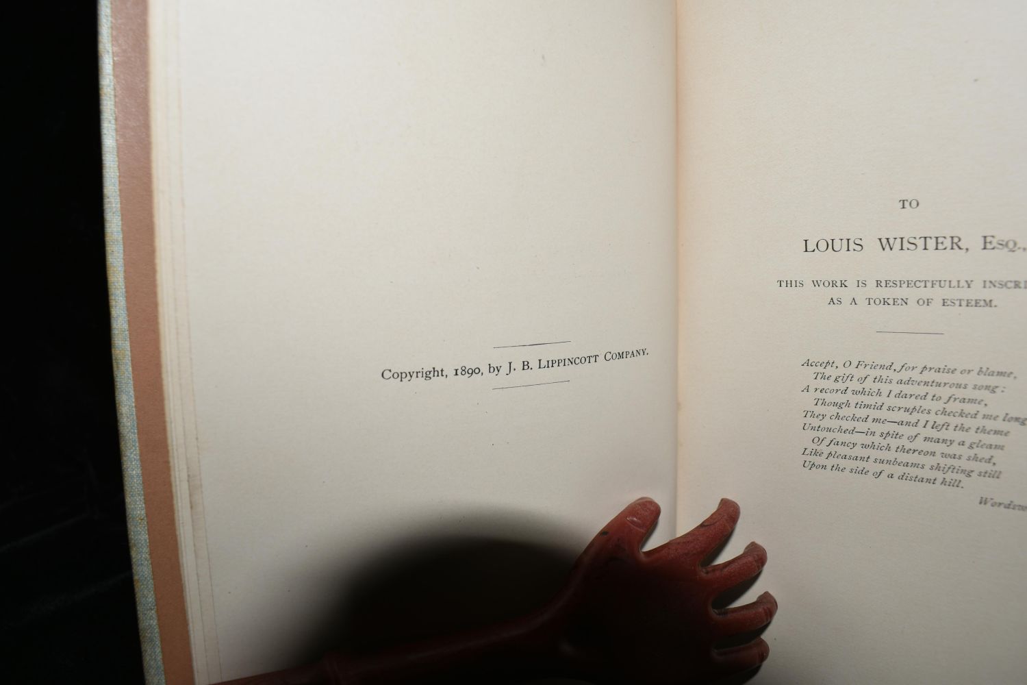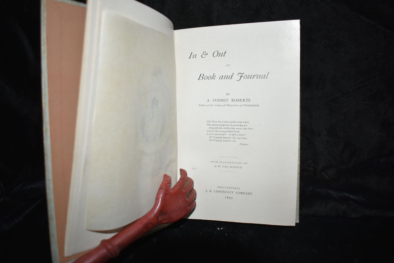 In & Out of Book and Journal by Sydney Roberts. Published by Lippincott, Philadelphia (1890). Very rare 1st Edition in very good condition. Publishers original embossed silver cloth hardback with silver gilt and grey lettering on name plates. 104 pgs with many illustrations. 7 1/8″ x 4 3/4″