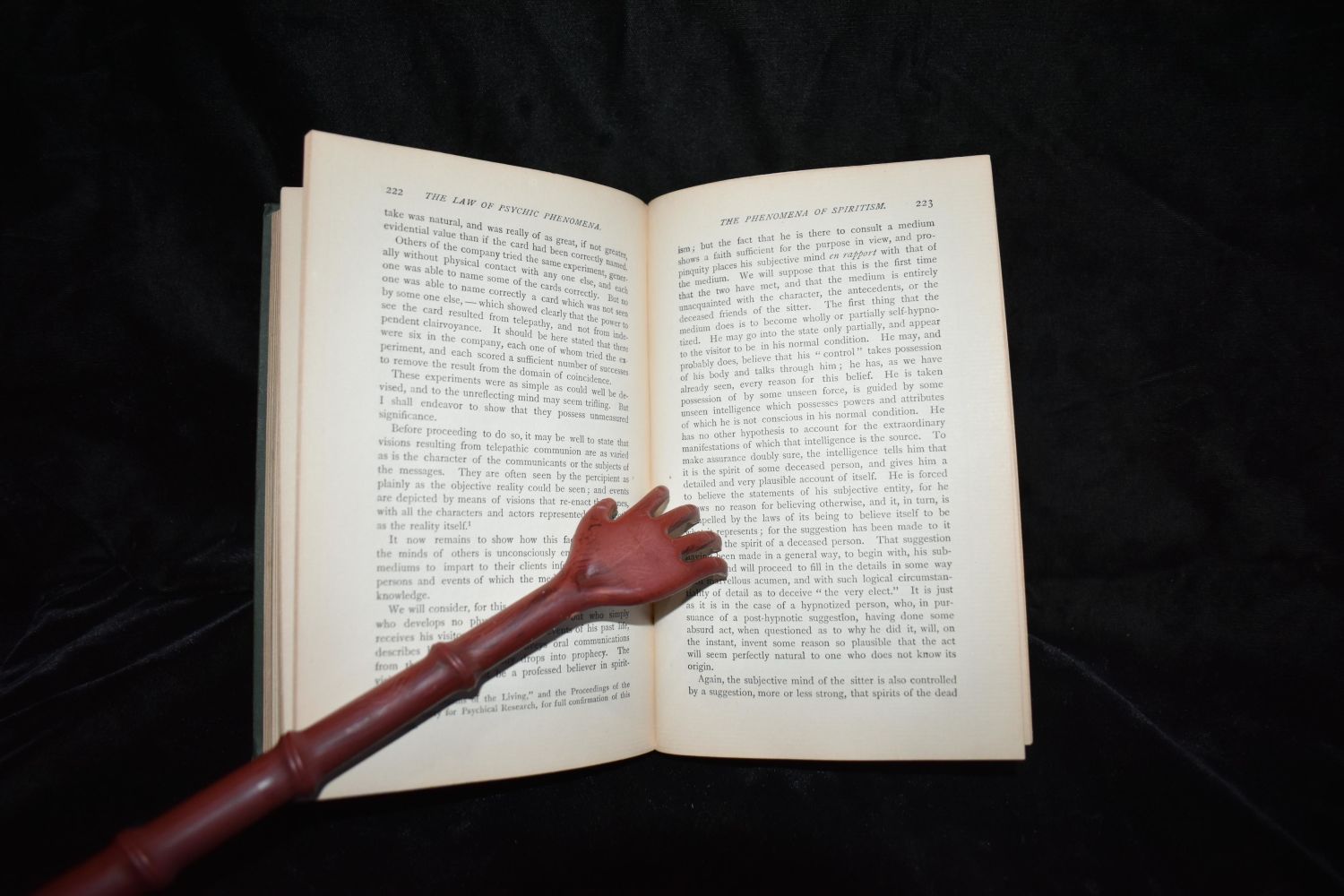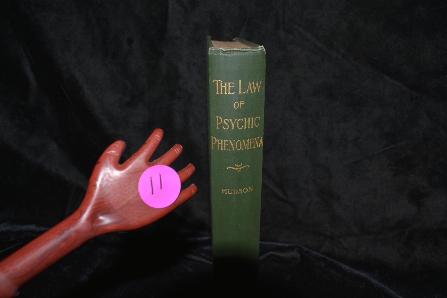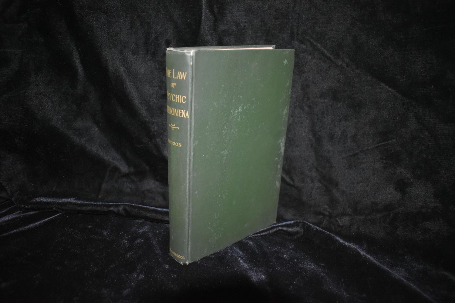 The Law of Psychic Phenomena. A Working Hypothesis for the Systematic Study of Hypnotism, Spiritism, Mental Therapeutics, etc. by Thomson Jay Hudson. Published by Chicago, A. C. McClurg (1901). Very Good Condition. Minor shelf wear, minor page foxing. Publishers original green cloth hardback with gold gilt to spine. 409 pgs plus ads. 7 5/8" by 5 1/4"