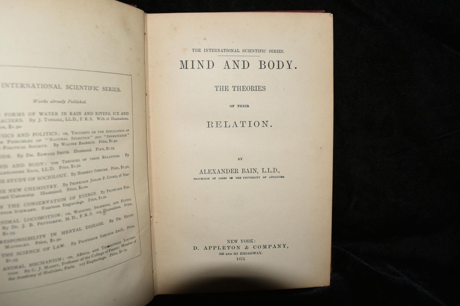 Mind and Body: The Theories of Their Relation by Alexander Bain. Published by D. Appleton And Company, NY (1875). International Scientific Series. Very Good + Condition. Publishers original red cloth hardback with black and gold gilt. 196 pgs plus ads.