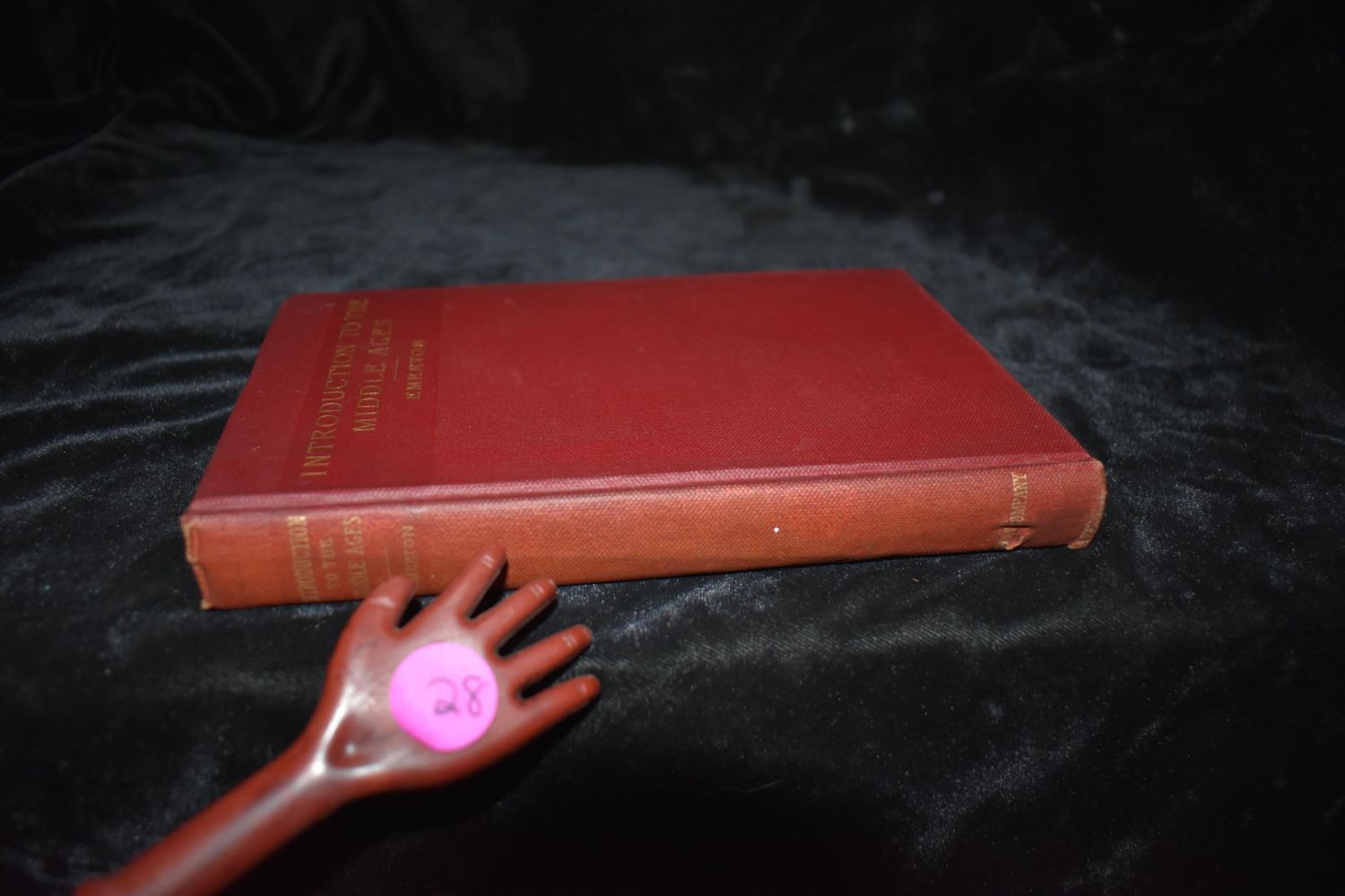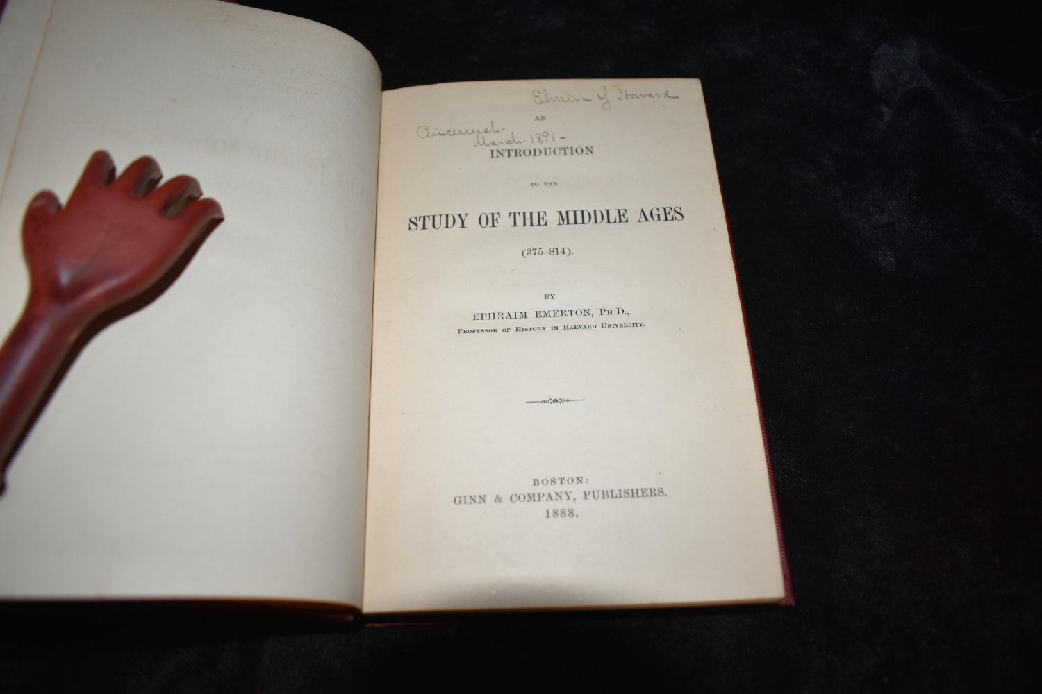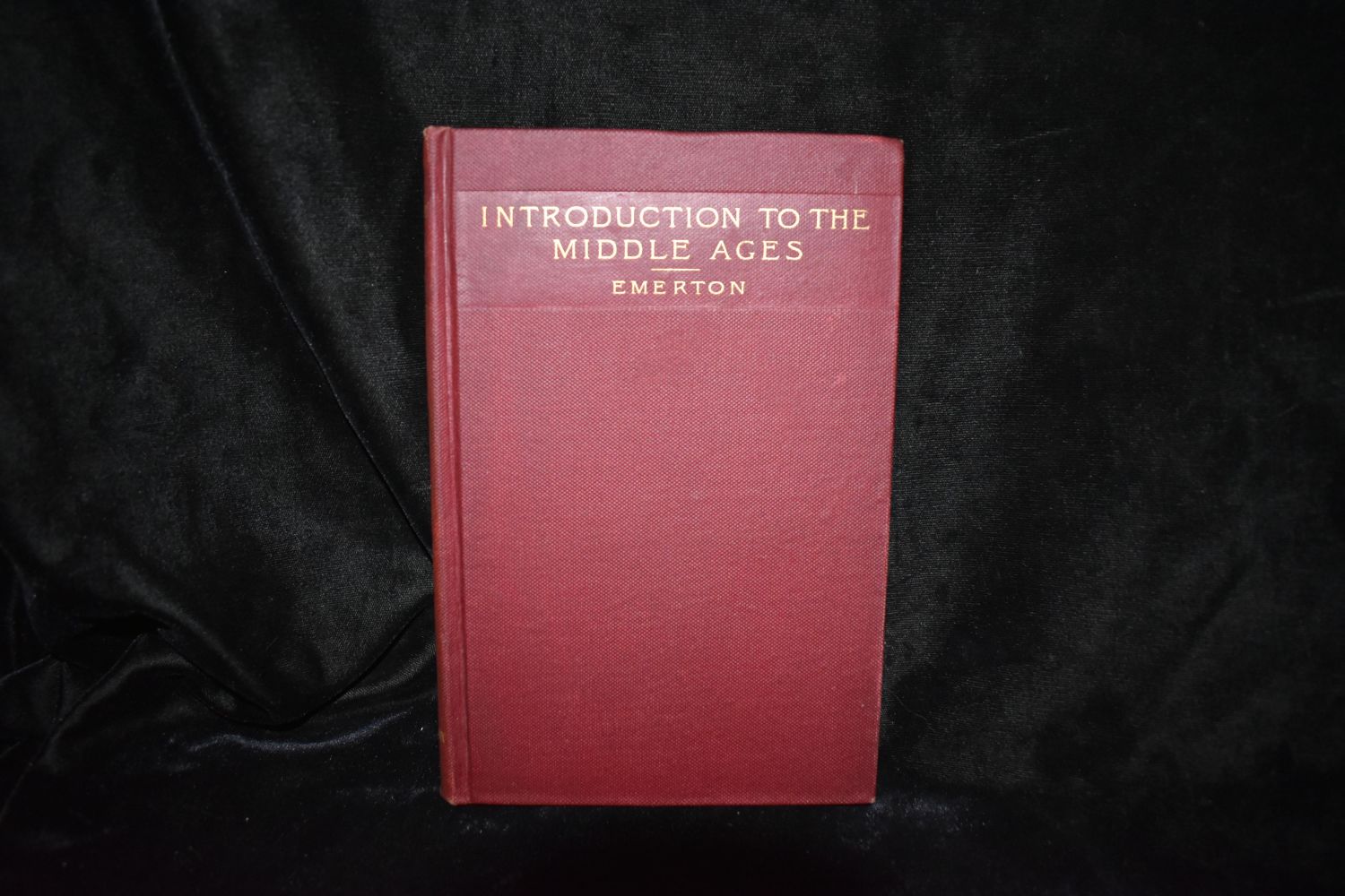 AN INTRODUCTION TO THE STUDY OF THE MIDDLE AGES (375-814) by Ephraim Emerton. Published by Ginn & Co., NY (1888). 1st Edition. Excellent condition. Has pencil notes inside the back cover by first owner. Publishers original red cloth hardback with gold gilt. 268 pgs 7 1/2" by 5"