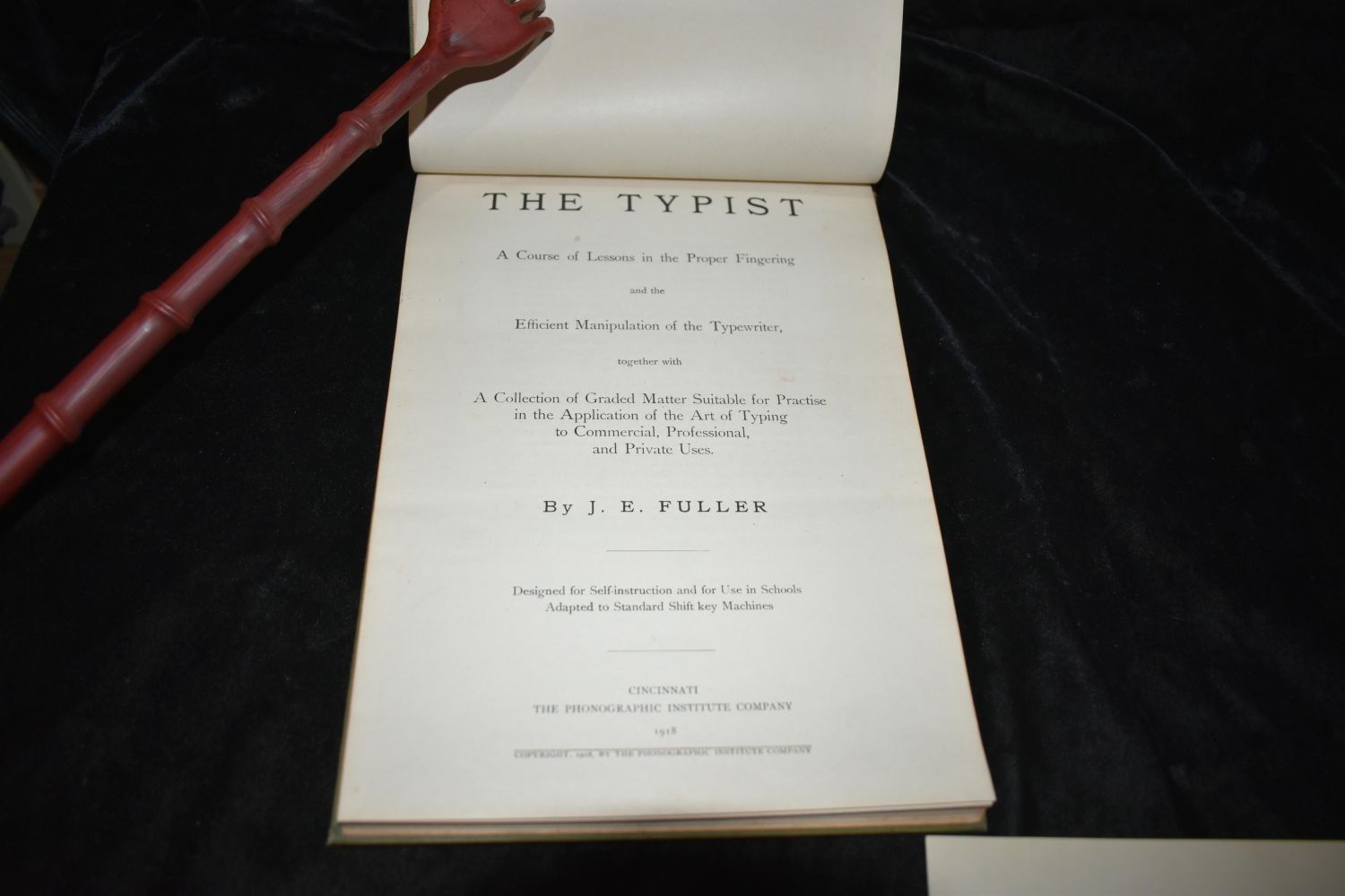 The Typist a course of lessons in the proper fingering and the efficient manipulation of the typewriter, together with a collection of graded matter suitable for practise in the application of the art of typing to commercial, professional, and private uses / by J. E. Fuller. Published by the Phonographic Institute, Cincinnati, Ohio 1918 1st Edition. Would have been one of the first books published as it went to the editors mother’s book collection. Fairly rare book. Abe books has none and only 6 of the first editions in libraries shown on worldcat in the U.S.. Very Good condition with only minor wear to corners. Publishers original green cloth hardback with gold gilt to cover. 142 pgs 10 5/8" by 7 3/4"