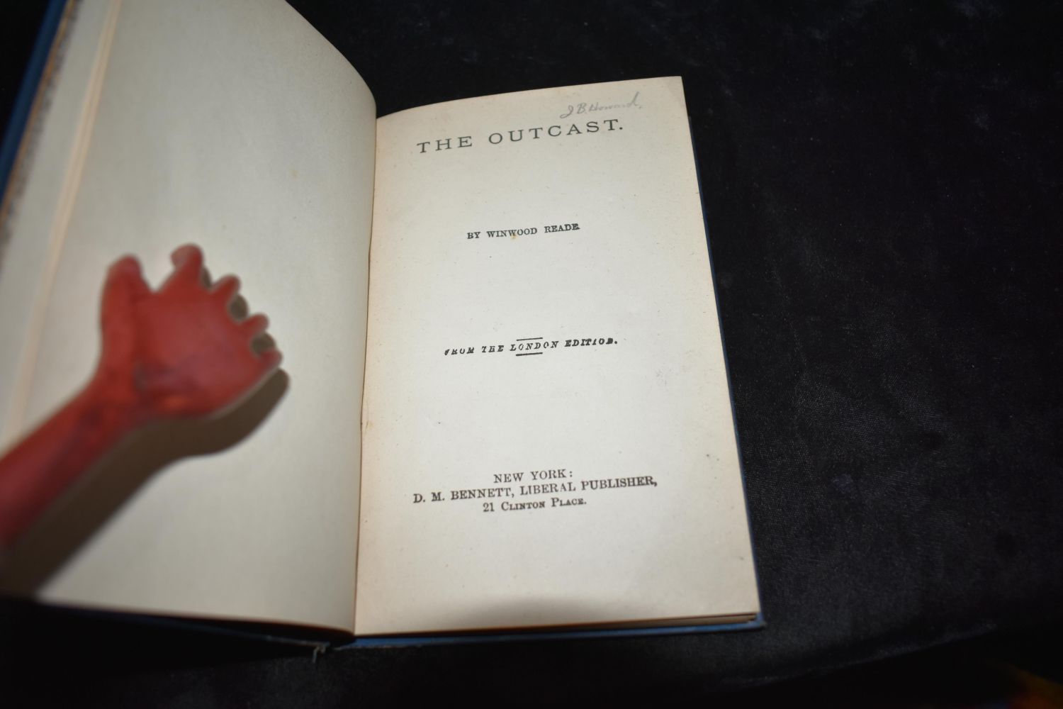 The Outcast. by W. Winwood Reade. Published by New York : D.M. Bennett 1876. 1st American Edition. No date on title page. "From the London Edition" is indicated on worldcat as 1876. Very good condition. Publishers original blue cloth hardback with gold gilt to spine. 1st owner was Jerome Bird Howard (phonographic institute). 100 pgs plus ads. 7 3/8" by 5"