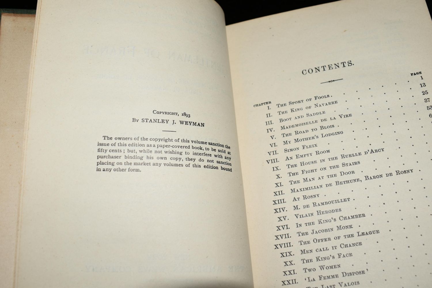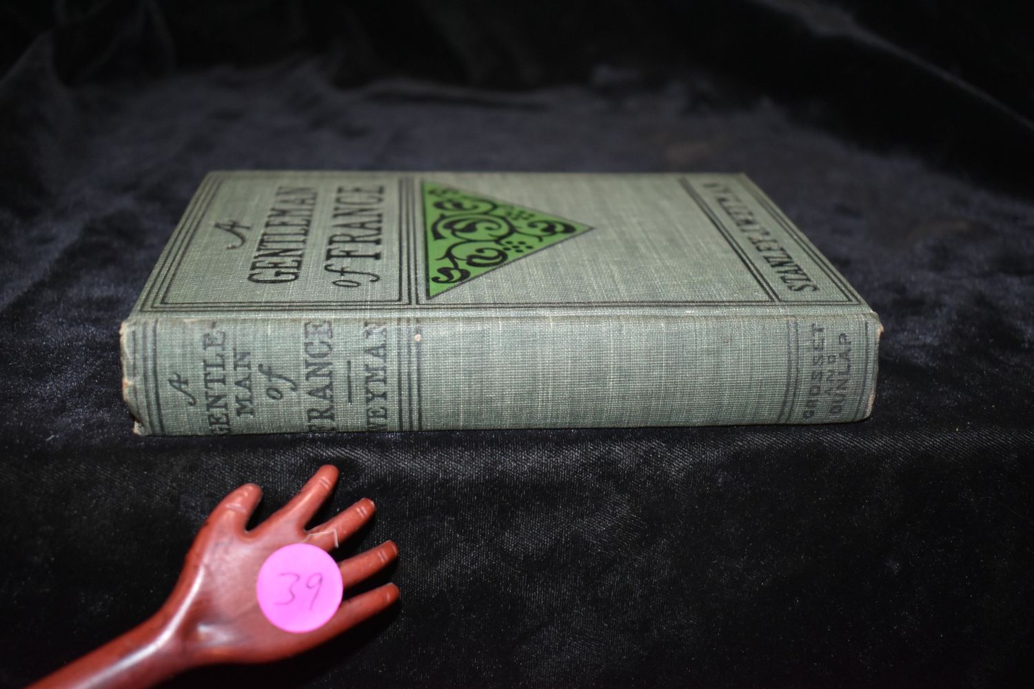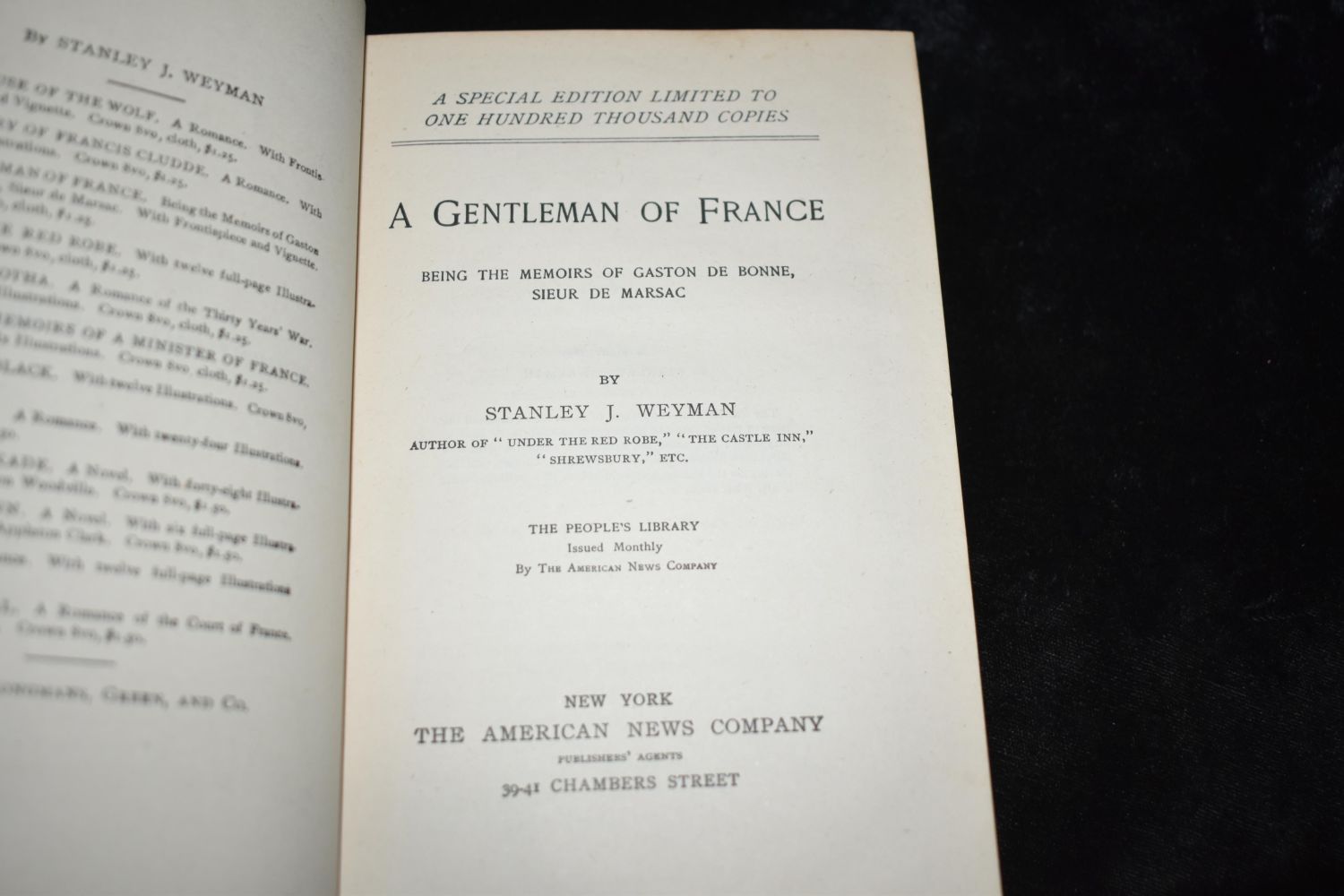 A Gentleman of France – Being The Memoirs of Gaston De Bonne Sieur De Marsac by Stanley J. Weyman. Published by The American News Company, New York (1893). 1st Edition. Excellent condition. Very minor shelf wear with some pencil writings from first owner inside back cover. Publishers original green cloth hardback with black print/gilt. 412 pgs plus ads. 7 1/8" by 5"