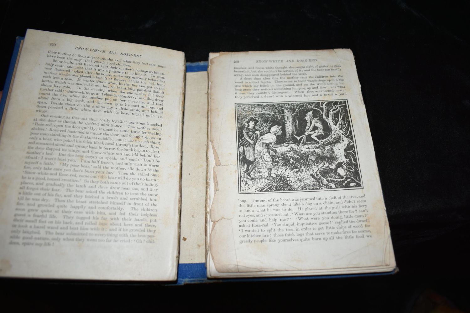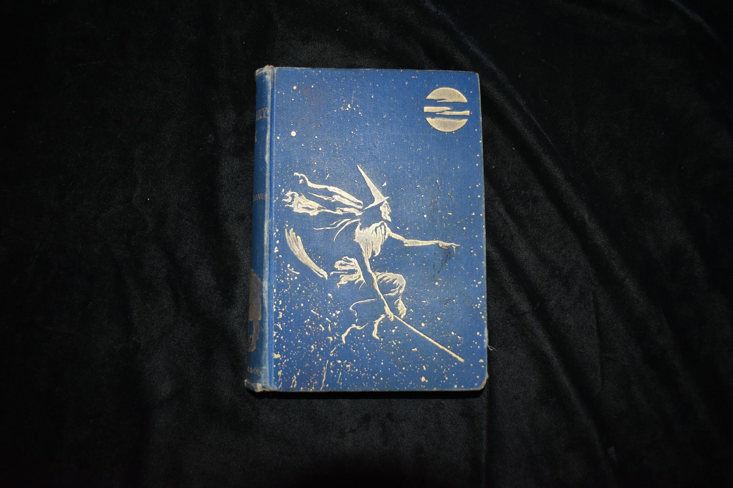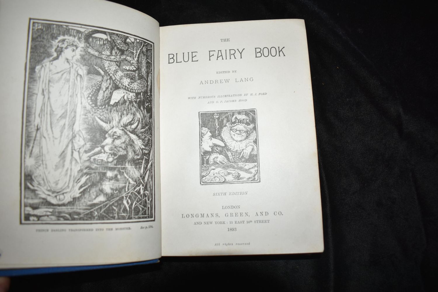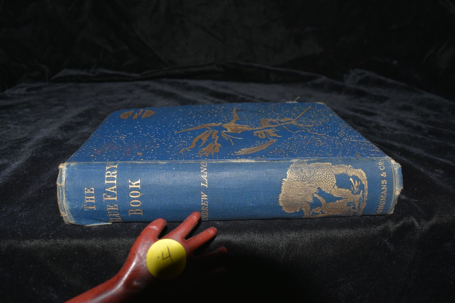 The Blue Fairy Book by Andrew Lang. Published by Longmans, Green, London (1893). Fair amount of wear to board edges and corners. Pg 261 is detached but still in place. The binding is broke at that pagination. Needs a professional overhaul or just admired for the beautiful piece of history that it is. Publishers original blue cloth hardback with gold gilt to cover and spine. Gold gilt all around page edges. 390 pgs 7 1/4" by 5 3/8"