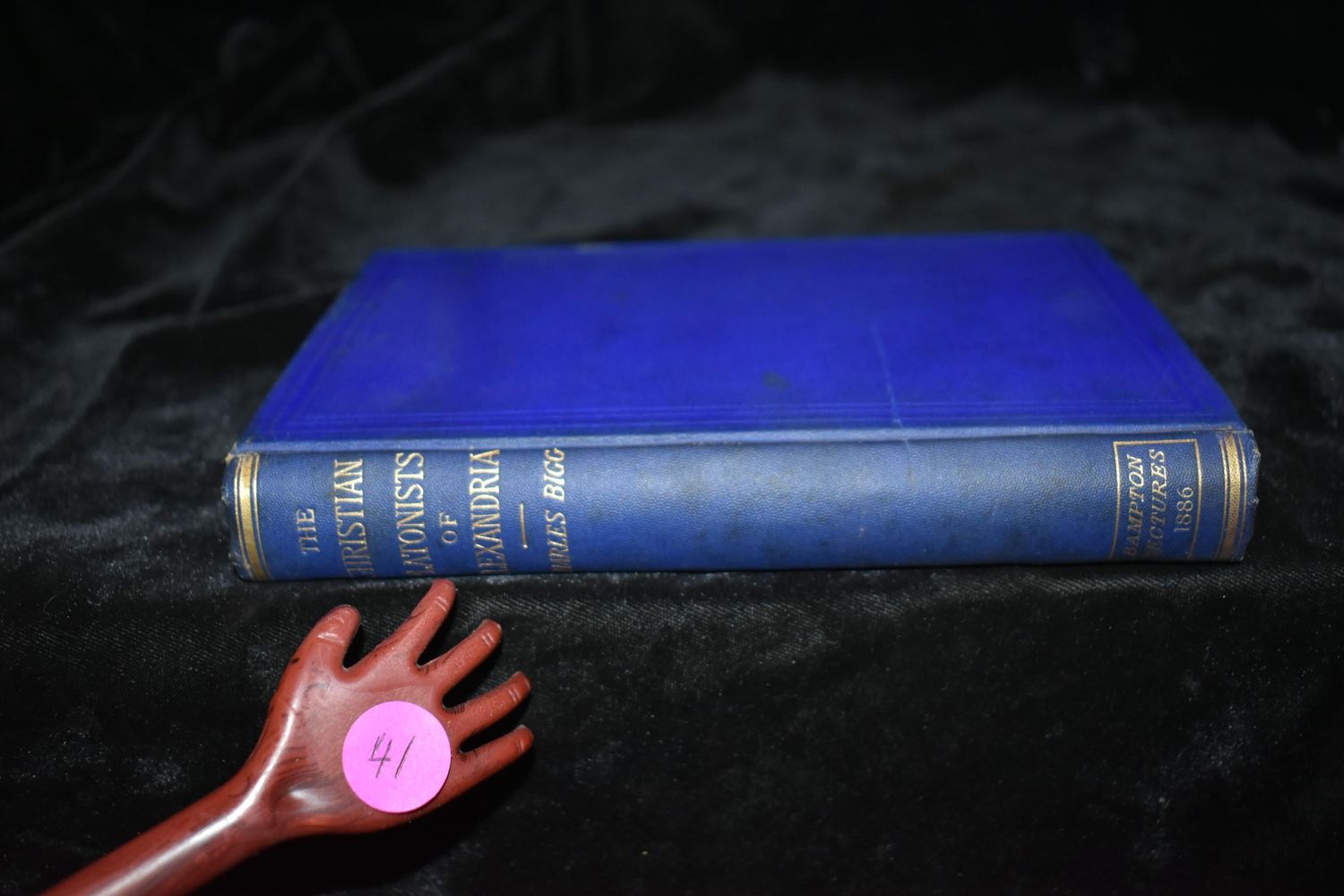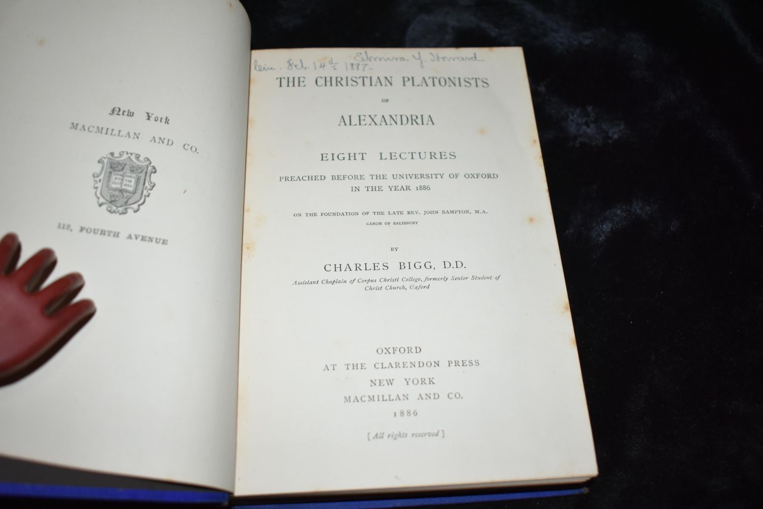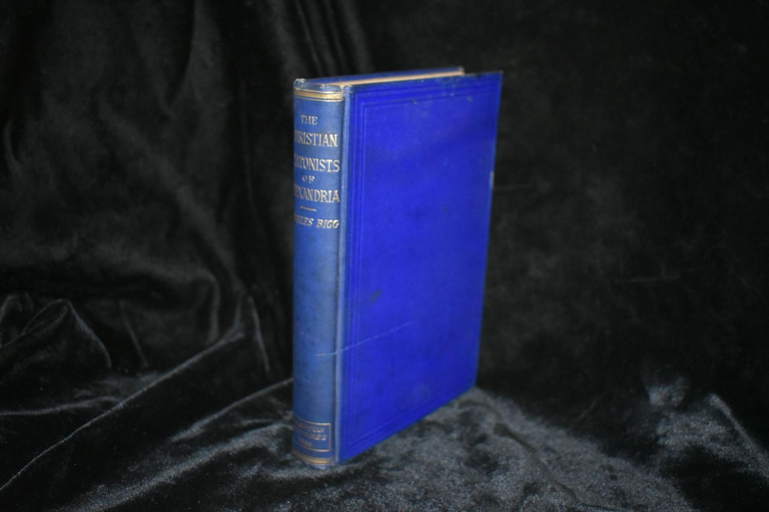 The Christian Platonists of Alexandria. Eight lectures preached before the university of Oxford in the year 1886. On the foundation of the late Rev. John Bambton, M.A. Canon of Salisbury by Charles D.D. Bigg. Published by Oxford: At the Clarendon Press, (1886). 1st Edition. Excellent condition. Very minor shelf wear to corners. Publishers original blue cloth hardback with gold gilt to spine. 304 pgs. 7 5/8" by 5 3/8"