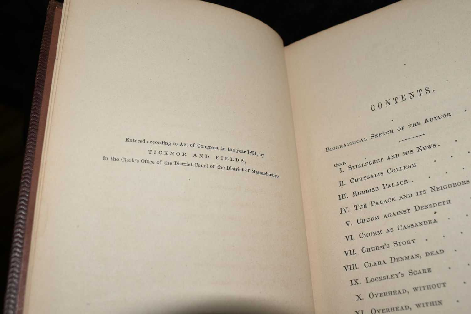 Cecil Dreeme by Theodore Winthrop. Published by Ticknor and Fields, Boston (1862). Good Condition. Spine is faded and brittle. Pages 337 – 358 are creased in from being mishandled (see photo). Publishers original brown decorative embossed hardback. 360 pgs and 16 pgs of ads. 7 3/8" by 5 1/8"