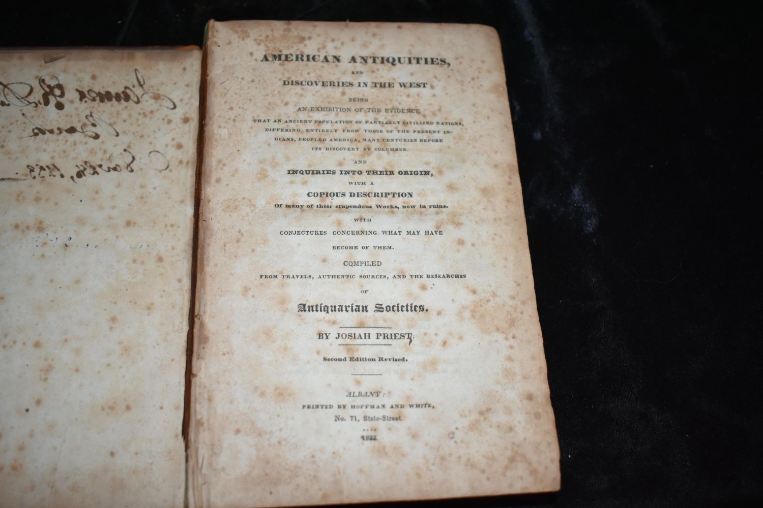 AMERICAN ANTIQUITIES AND DISCOVERIES IN THE WEST: Being An Exhibition Of The Evidence That An Ancient Population Of Partially Civilized Nations Differing Entirely From Those Of The Present Indians, Peopled America, Many Centuries Before Its Discovery By Columbus. And Inquiries Into Their Origin, With A Copious Description of many of their stupendous Works, now in ruins. With Conjectures Concerning What may Have Become Of Them. Compiled From Trave by Josiah Priest. Published by Printed by Hoffman and White (1833). Fair condition. Boards are detached and first couple of pages are loose. All pages are present as well as the map. Pages have foxing throughout. 400 pgs 8 3/8" by 5 3/8"