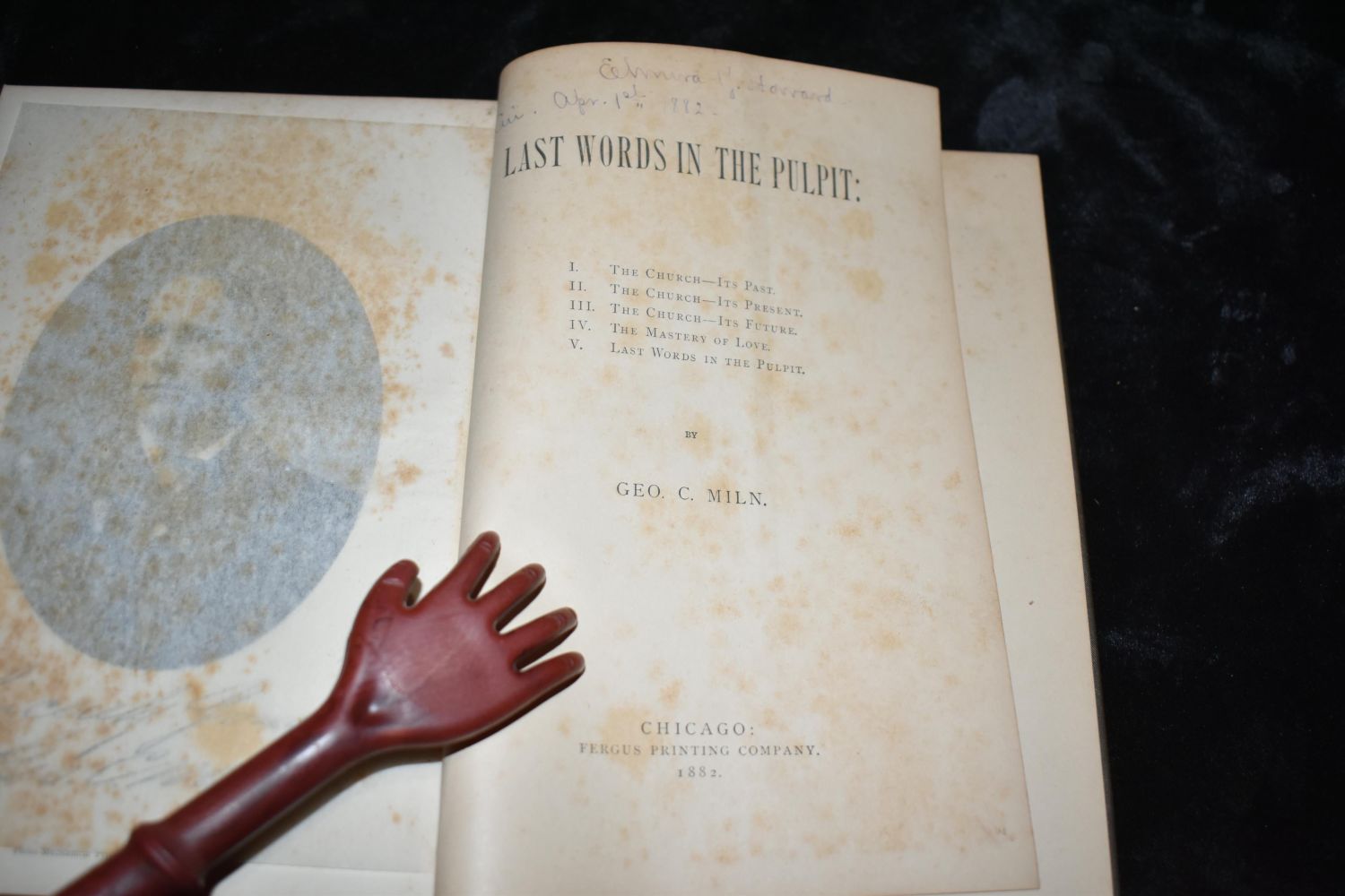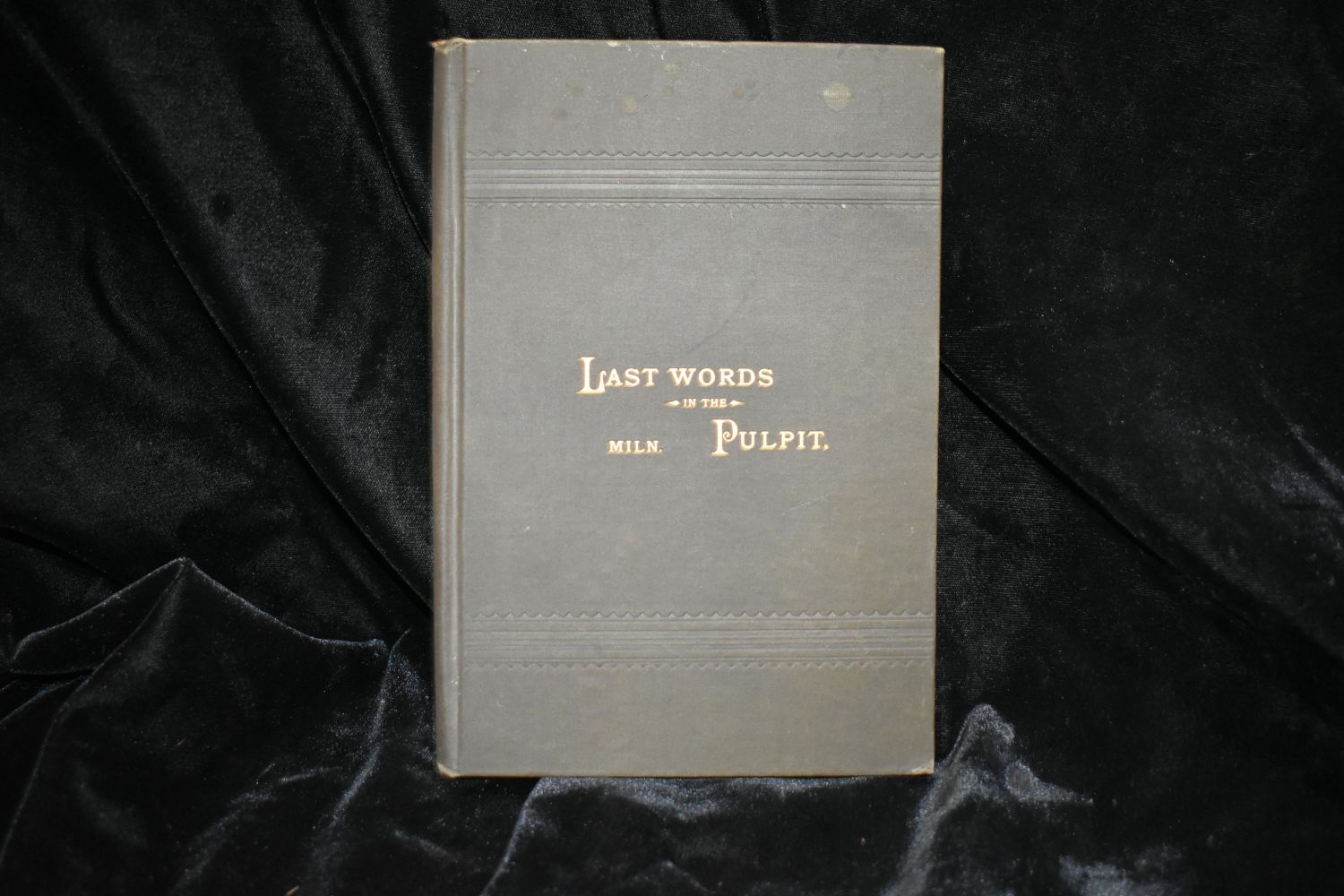 Last Words in the Pulpit by Geo Miln. Chicago, Fergus Printing Co. 1882. 1st Edition. Foxing to first few pages. Past that very good condition. Publishers original black cloth hardback with gold gilt to spine and cover. 87 pgs 8 1/4" by 5 5/8"