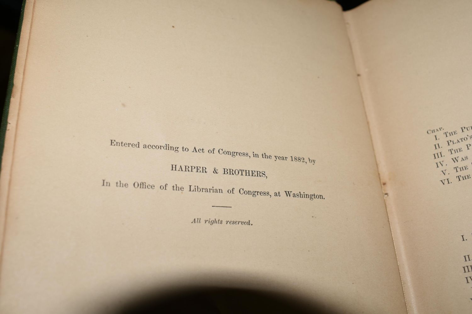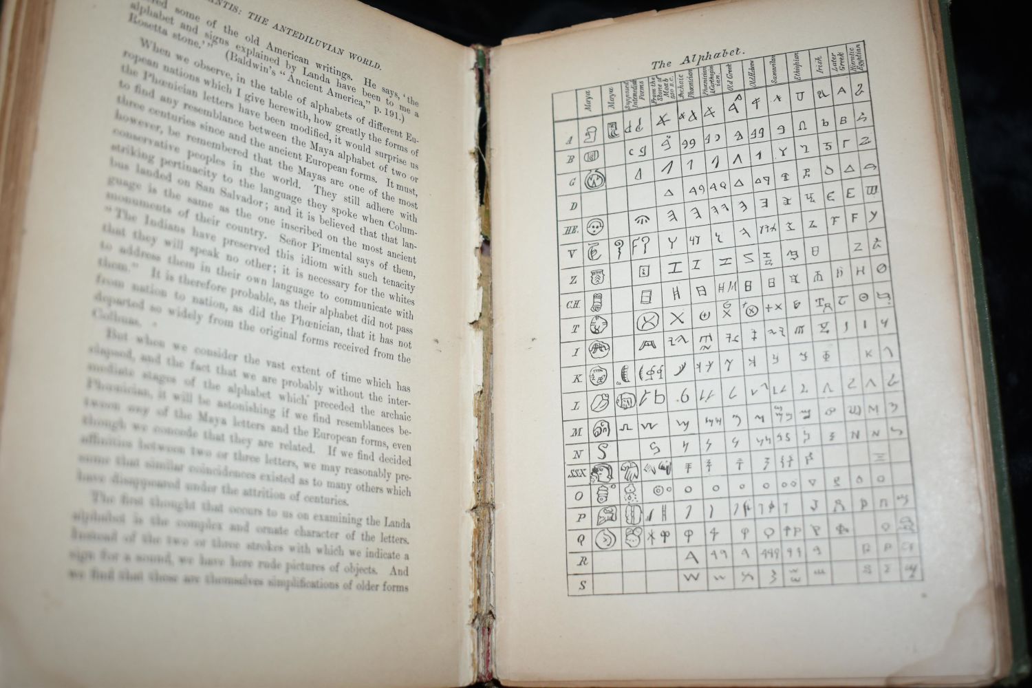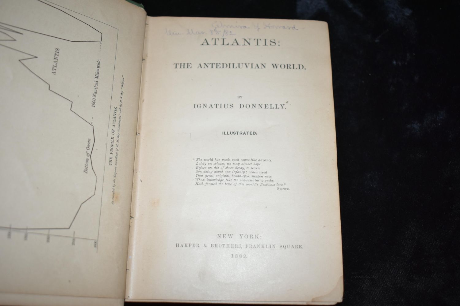 Atlantis: The Antediluvian World by Ignatius Donnelly. Published by Harper & Brothers, New York (1882). 1st Edition. Restoration project. Binding is loose but all pages are there. Cover is very worn. Publishers original green cloth hardback with gold gilt to cover and spine. 480 pgs. 7 1/2" by 5 1/4"