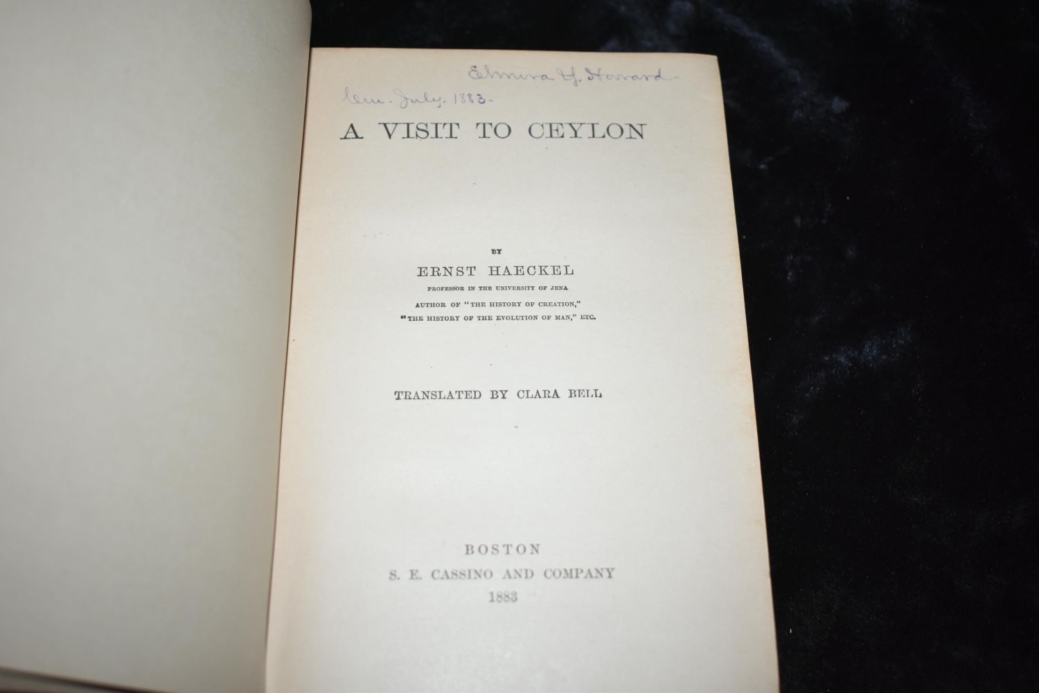 A Visit to Ceylon by Ernst Haeckel. Published by S. E. Cassino and Company, Boston (1883). 1st edition. Overall very good condition. Spine has some fading/soiling to name plate with a couple fray spots to spine. Some page foxing to first few and last few pages. Publishers original green cloth hardback with title plate. Gold gilt to page tops. 337 pgs and 24 pgs of ads. 8" by 5 3/4"