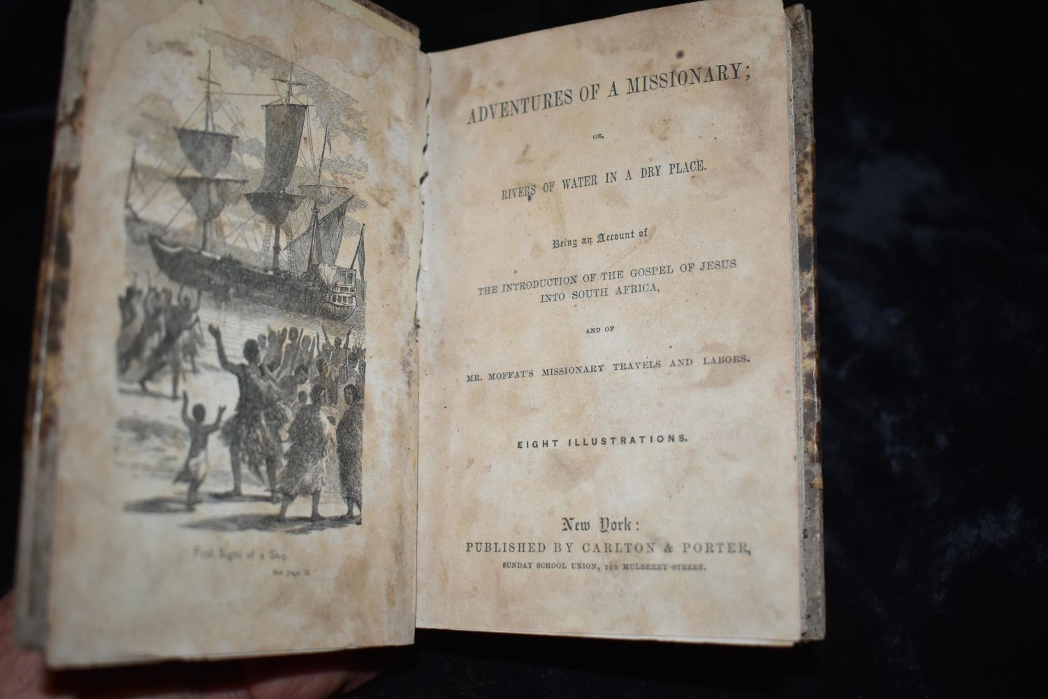 Adventures of a Missionary; or, Rivers of Water in a Dry Place. Being an Account of the Introduction of the Gospel of Jesus into South Africa, and of Mr. Moffat’s Missionary Travels and Labors. Published by New York : Carlton & Porter 1800’s. 1st Edition. Rough condition externally. Internally all there with foxing to pages. Deterioration radiating from the spine to the page edge next to spine on first 5 pages. Needs a new cover. Page 95 had its edge cut off probably to write a note but didnt cut in to the page content. Publishers original half leather with decorative boards. 295 pgs plus ads.6 3/8" by 4 1/2"