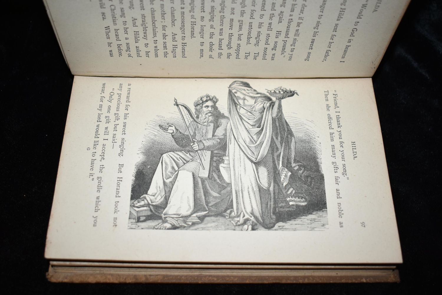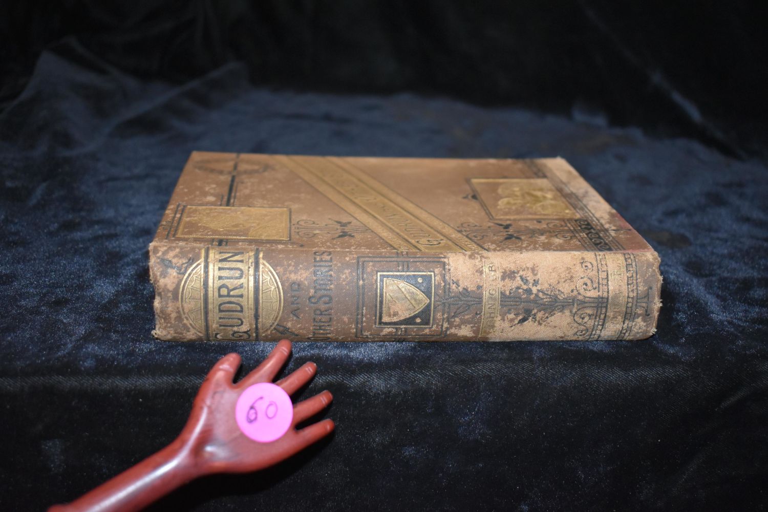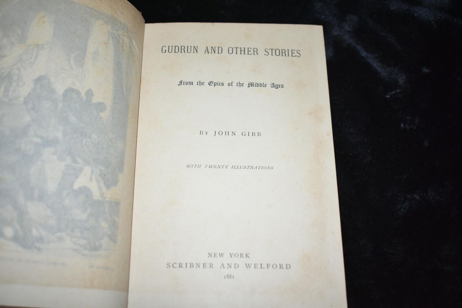 Gudrun and Other Stories from the Epics of the Middle Ages by John Gibb. Published by New York, Scribner and Welford 1881. 1st Edition. Cover has alot of fading. Internally pages are good with a little foxing. Needs rebound. Publishers original decorative brown cloth hardback with gold and black gilt/print. Pages are gold gilt all around. 301 pgs plus ads. 7 1/2" by 5 1/2"