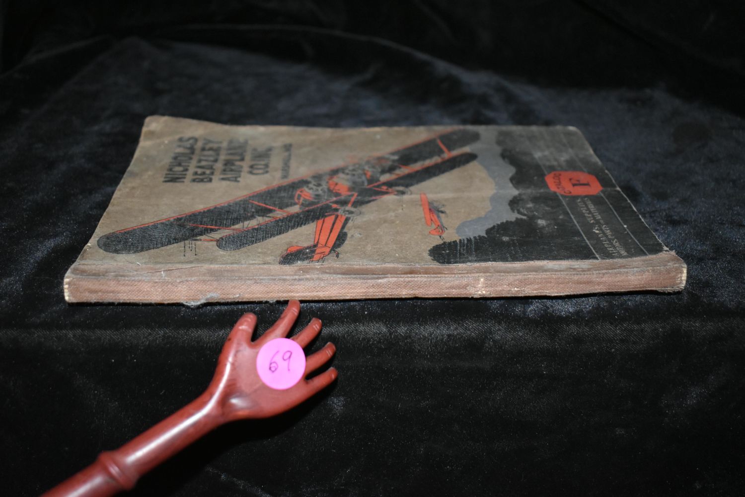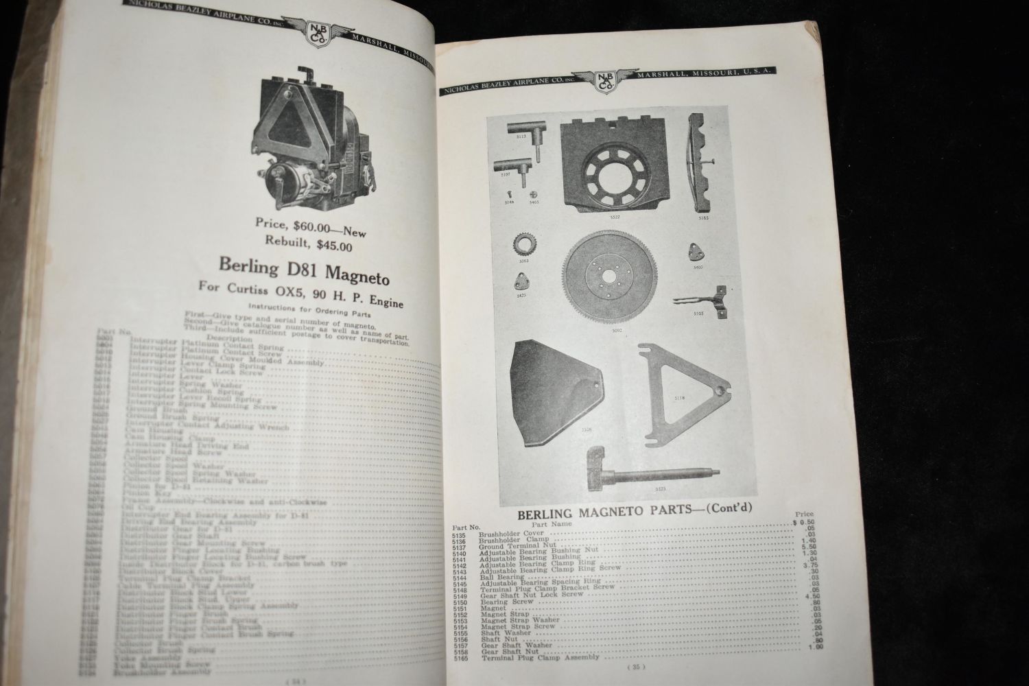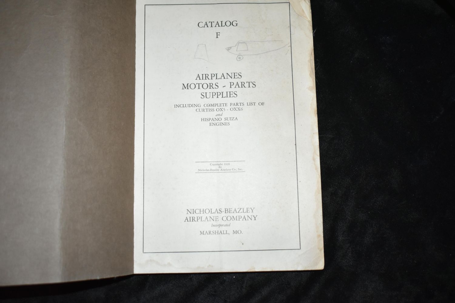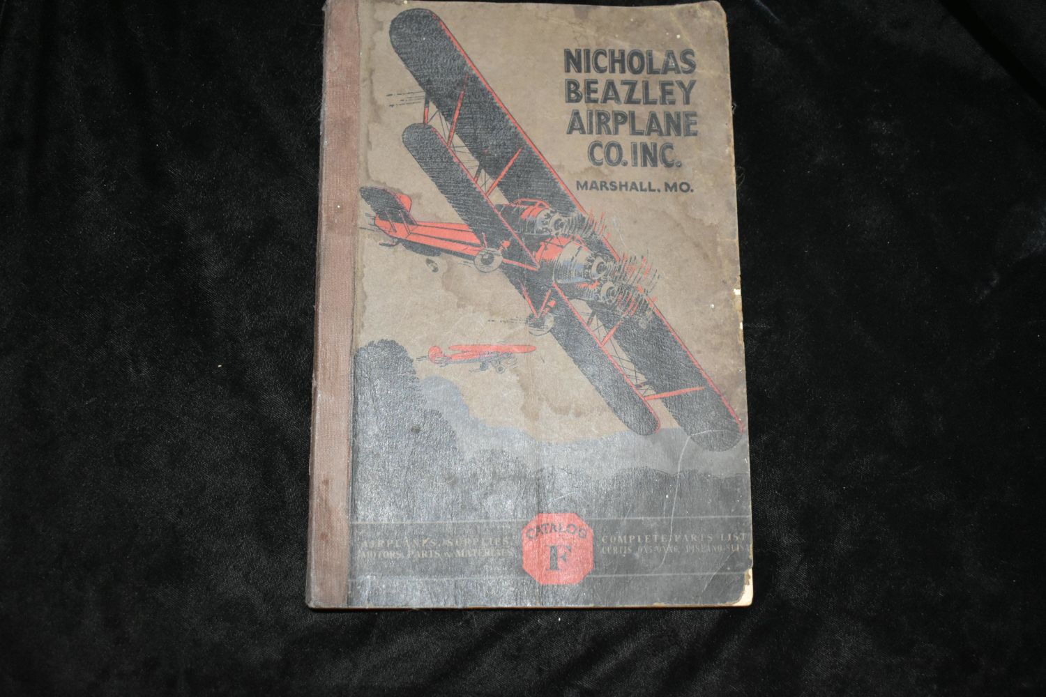 Catalog F : Airplanes, Motors, Parts, Supplies by Nicholas-Beazley Airplane Company. Published by Marshall, Mo. : Nicholas-Beazley Airplane Co. 1929. Early Aviation parts book. Decorative paperback with black and gold print. Fairly good condition for a paperback its age. Has some age/soiling to cover with a little damage to cover edges. Wear to corners with some corner bending to pages. 263 pgs. 10" by 6 1/2"
