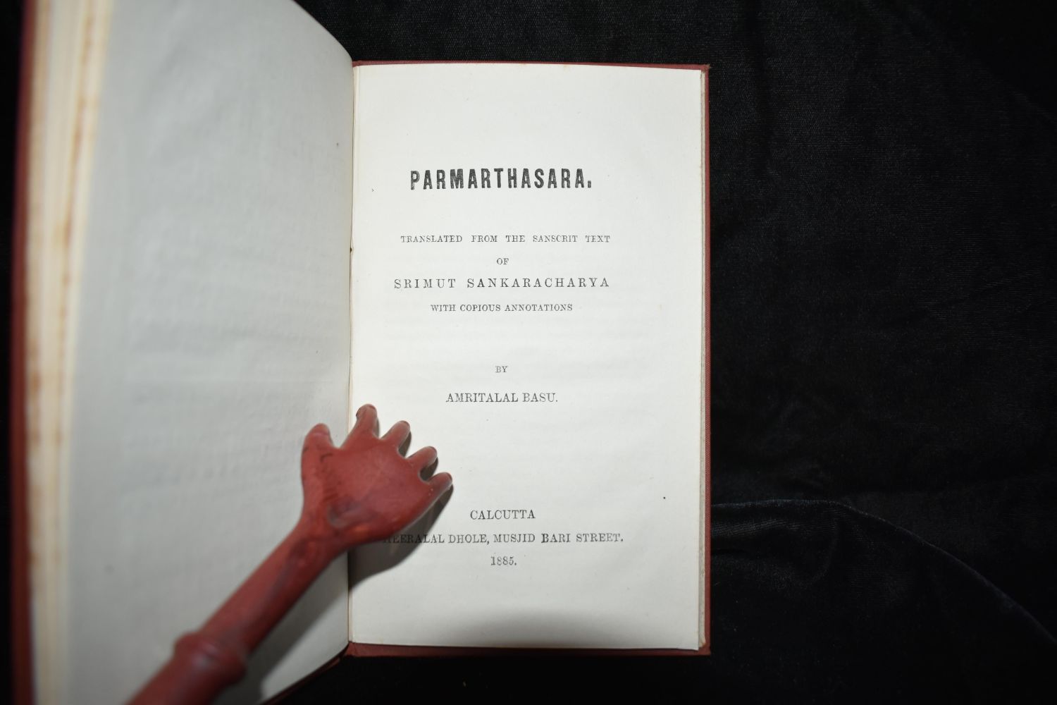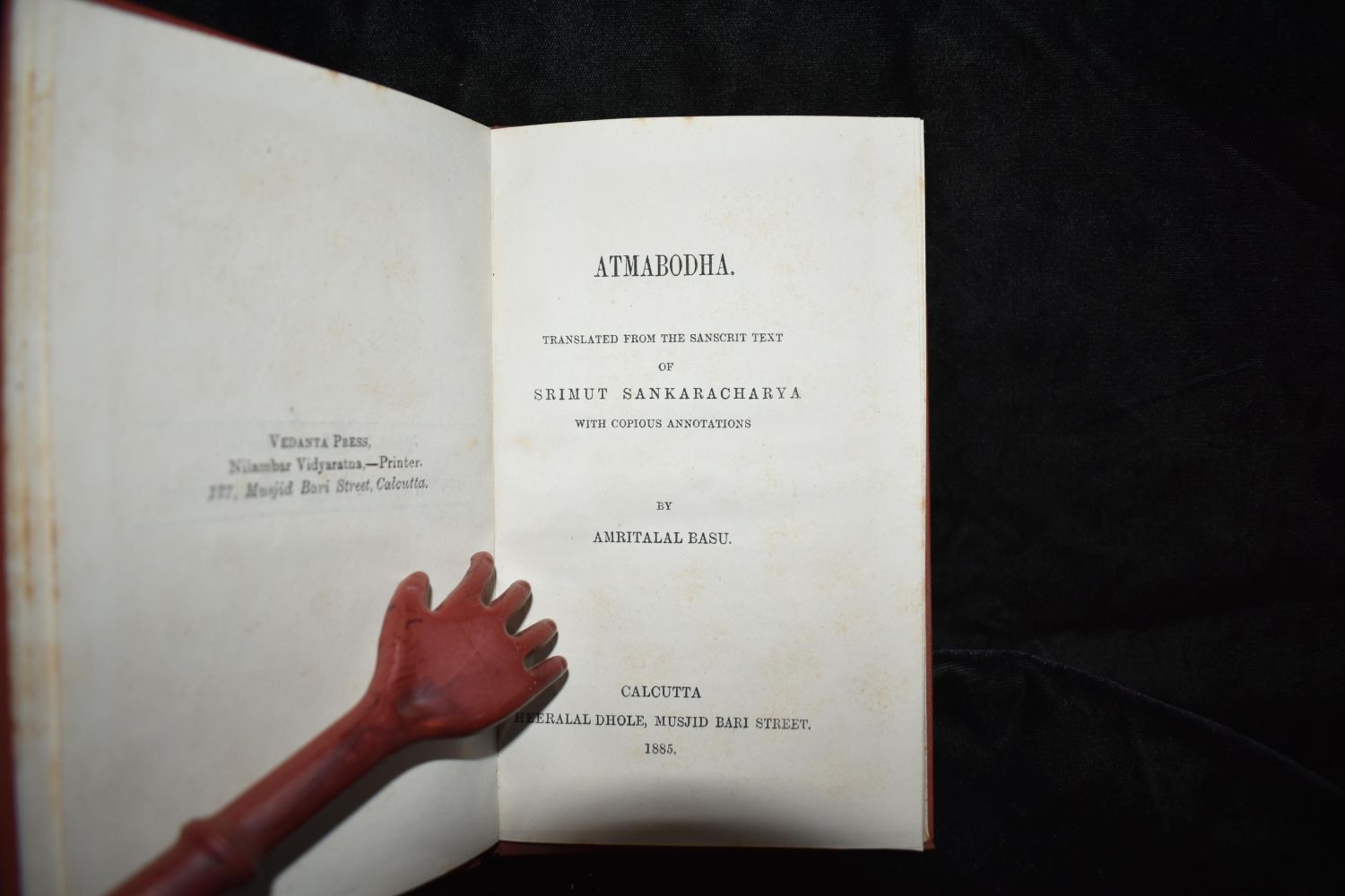 Atmabodha & Parmarthasara (2 books in 1) Translated from the Sanskrit Text of Seimut Sankaracharya with Copious Annotations by Amritalal Basu. Published in Calcutta 1885. Couldnt find an older publication in english on the web so presumed 1st english edition. Excellent Condition (a little foxing on 1st 2 pages). Publishers original red cloth hardback with gold gilt. 46 pgs. 7 1/4" by 4 1/4"
