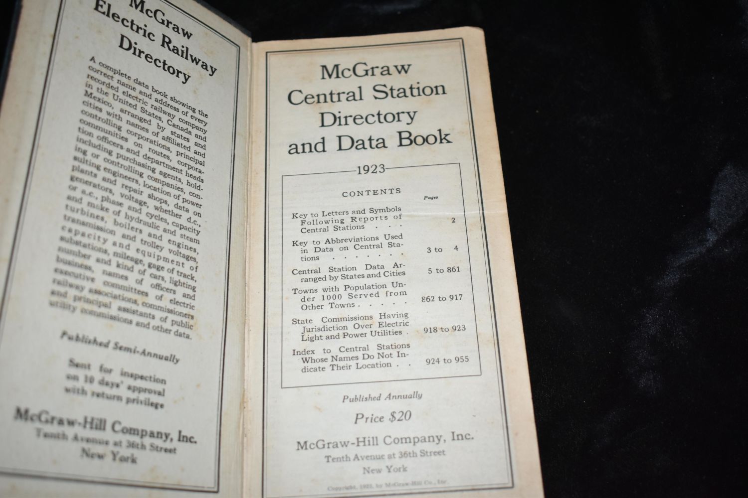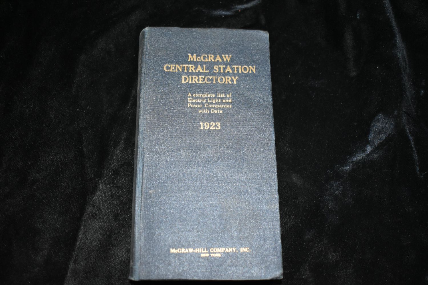 McGraw Central Station Directory : a complete list of electric light and power companies with data 1923. Publishers original black cloth softback with gold gilt to spine and cover. Very Good Condition. Minor shelf wear to corners. 955 pgs. 8 1/2" by 4 1/2"