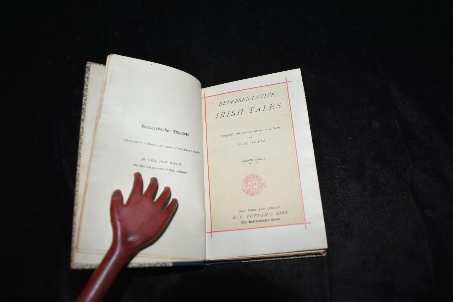 Irish Tales by W. B. Yeats. Published in New York and London by G. P. and Sons The Knickerbocker Press 1891. Publishers hardback blue cloth with flower patterns and gold gilt. Very good condition with only minor shelf wear. Decko style pages. 355 pgs plus ads. 5 5/8" by 4 1/2"