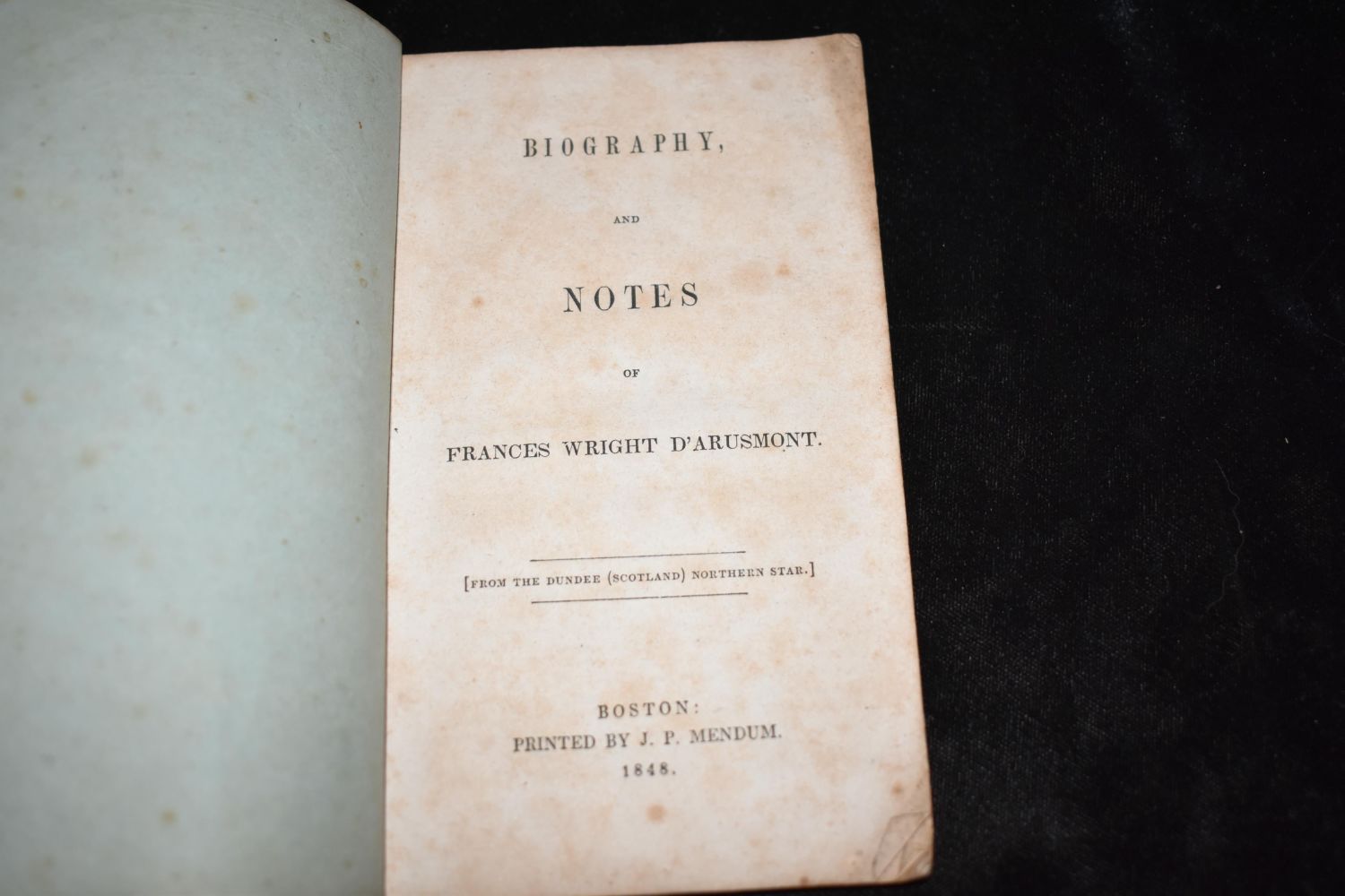 Biography and Notes of Frances Wright D’arusmont. Published by Boston J. P. Mendum 1848. Very rare 1st Edition paperback (not a reprint). Worldcat couldnt identify the 1st edition publisher of 1848. This book shows it clearly as J. P. Mendum Boston on the title page. It has some corner wear and age spots but is still intact. Internally a little foxing and age toning. 48 pgs 6 1/8" by 3 3/4"