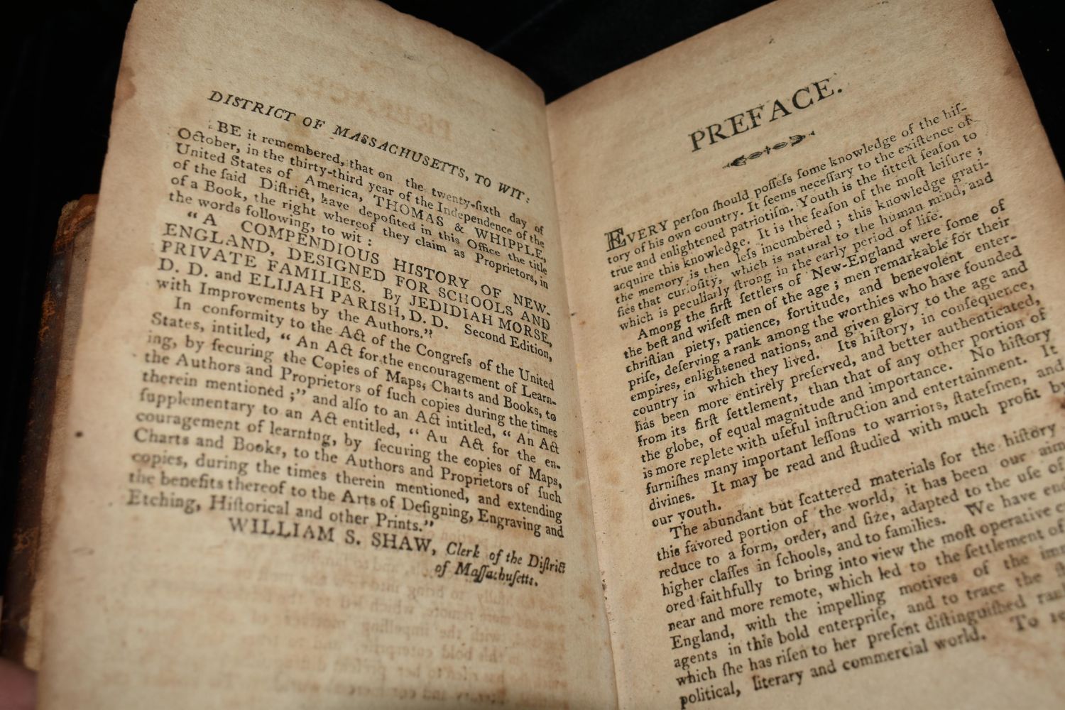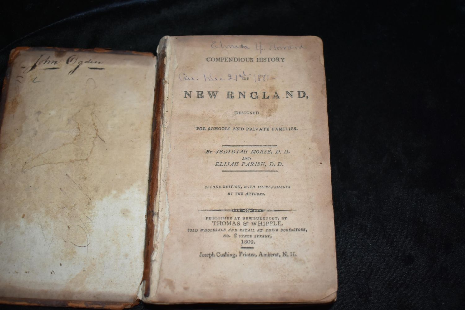 A COMPENDIOUS HISTORY OF NEW ENGLAND DESIGNED FOR SCHOOLS AND PRIVATE FAMILIES by Jedidiah Morse and Elijah Parish. Published by Thomas & Whipple 1809 2nd ed, Newburyport, MA 1809. Rough condition. Front cover is detached and spine is deteriorated. Binding is trying to seperate. Pages missing up to title page. Pages age toned but still readable. Publishers original full leather hardback. 336 pgs. 7" by 4 1/4"