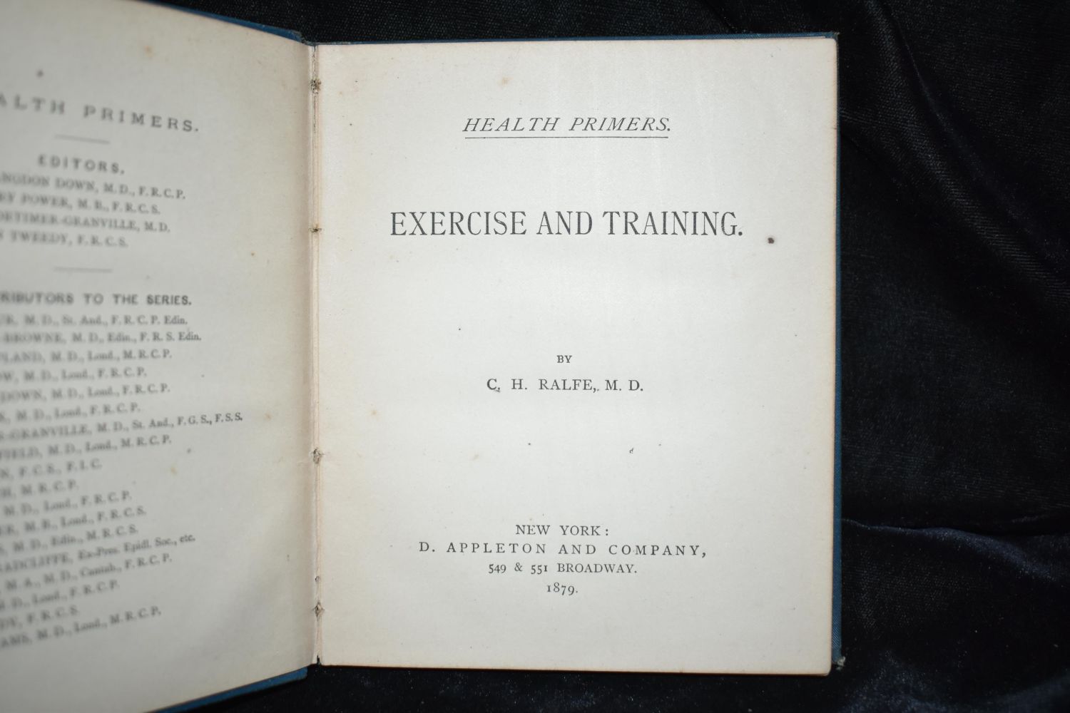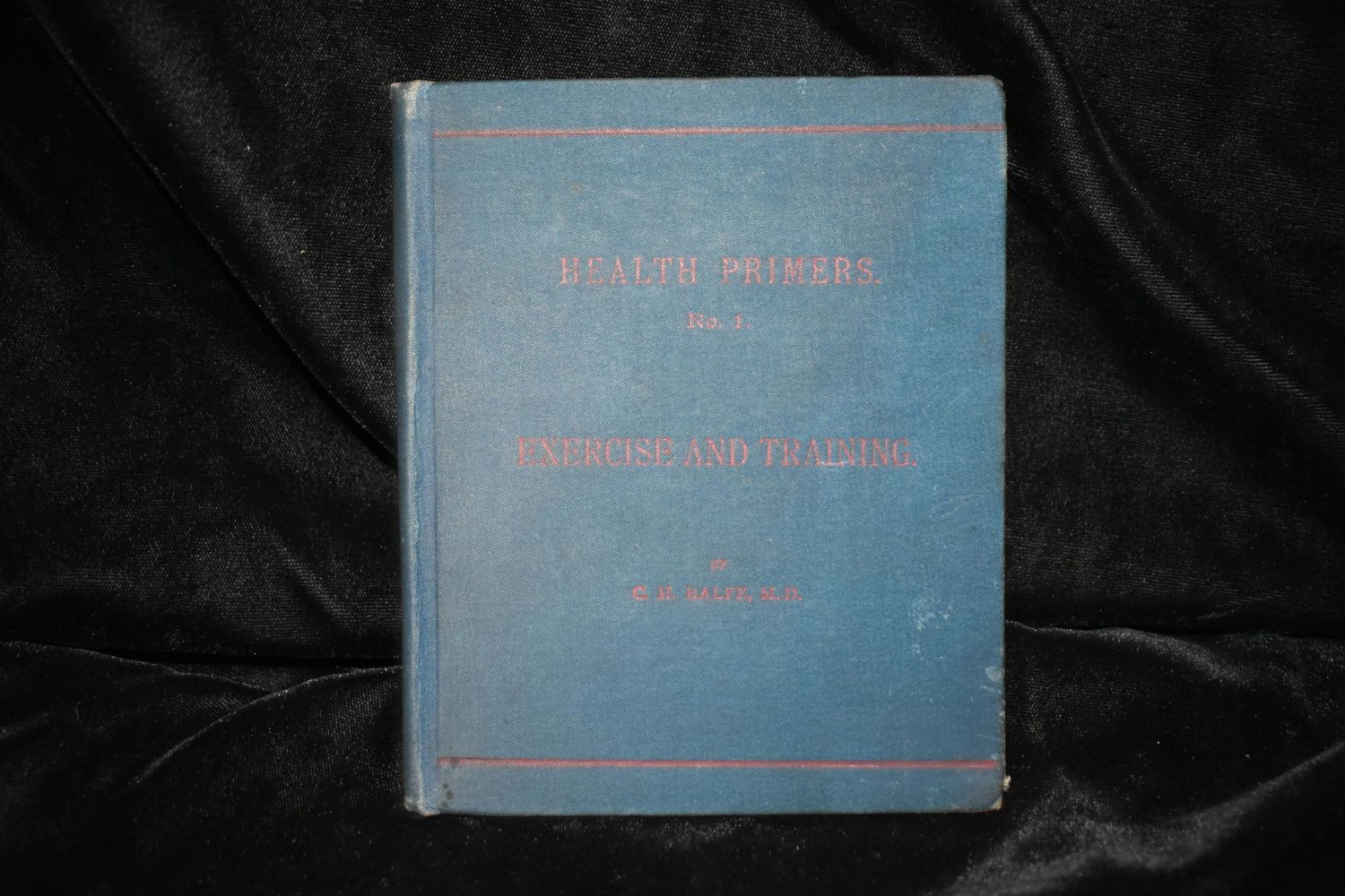 Exercise and Training by C H Ralfe. Published by New York : D. Appleton and Company 1879. 1st American Edition. Very Good condition. Minor shelf wear to corners. Last blank page was removed and there is age toning inside the covers. Publisher original blue cloth hardback with red print. 96 pgs. 5 3/4" by 4 7/8".