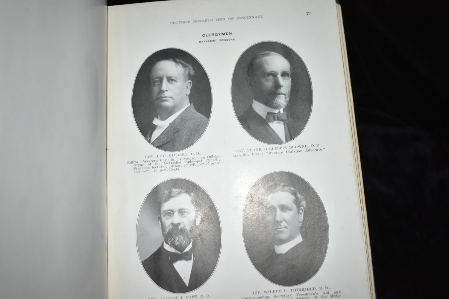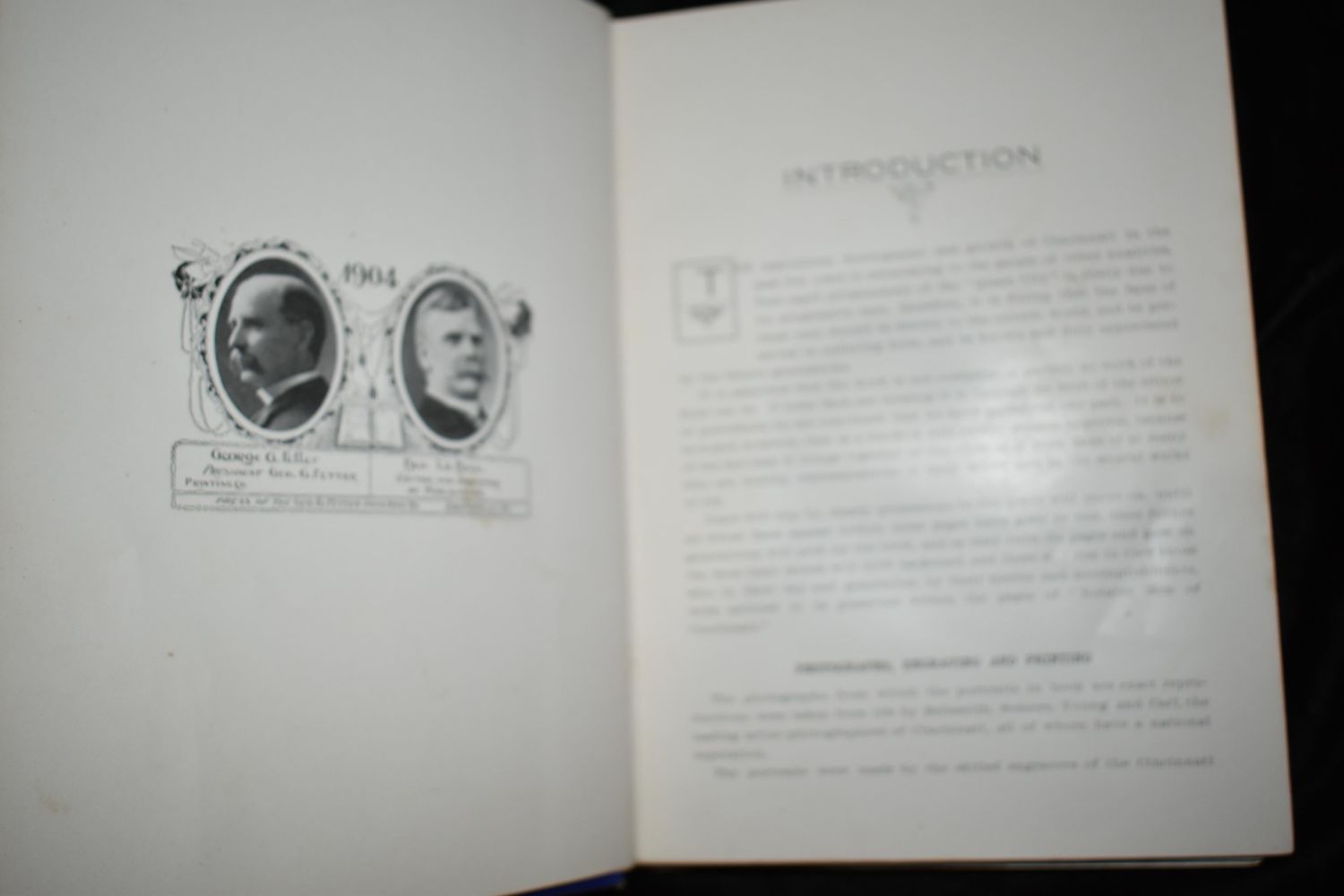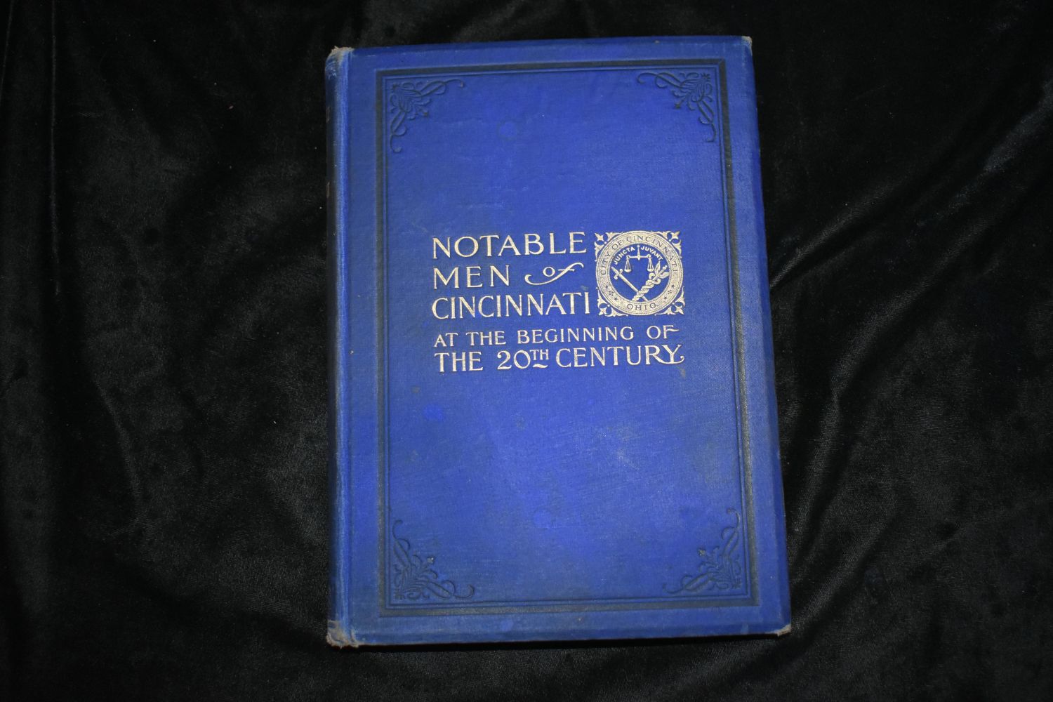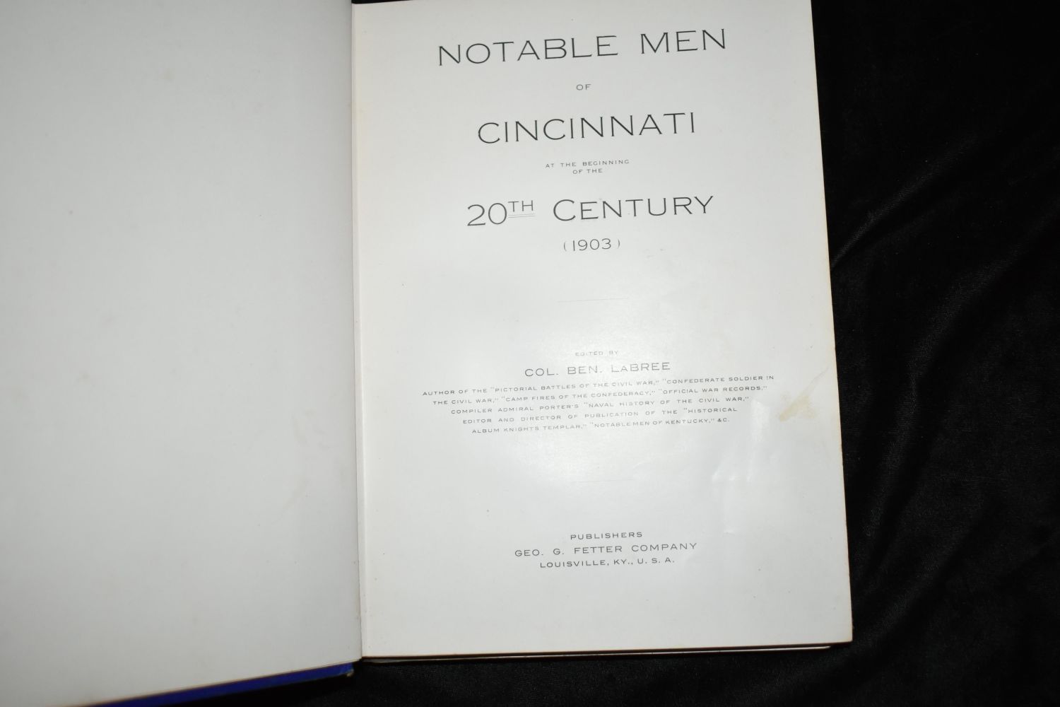 Notable Men of Cincinnati at the Beginning of the 20th Century (1903) by Col. Ben LaBree. Published by Geo. G. Fetter Printing Co, Louisville (1904). 1st Edition. Publishers original blue cloth hardback with gold gilt. Fairly good condition. Has all of its pages and they are in very good shape with the all around gold gilting to page edges. Needs rebount thought. Some shelf wear to corners. 267 pgs. 9 3/4" by 7 1/4"