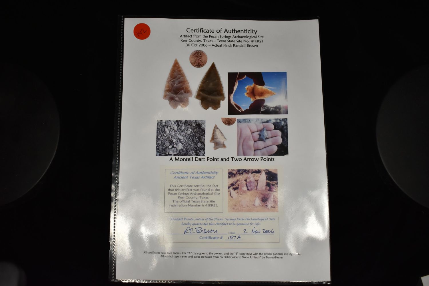 2 1/8" Montel Dart Point, COA Randall Brown, TX, Native American Artifacts