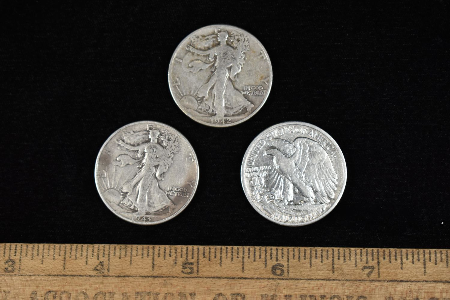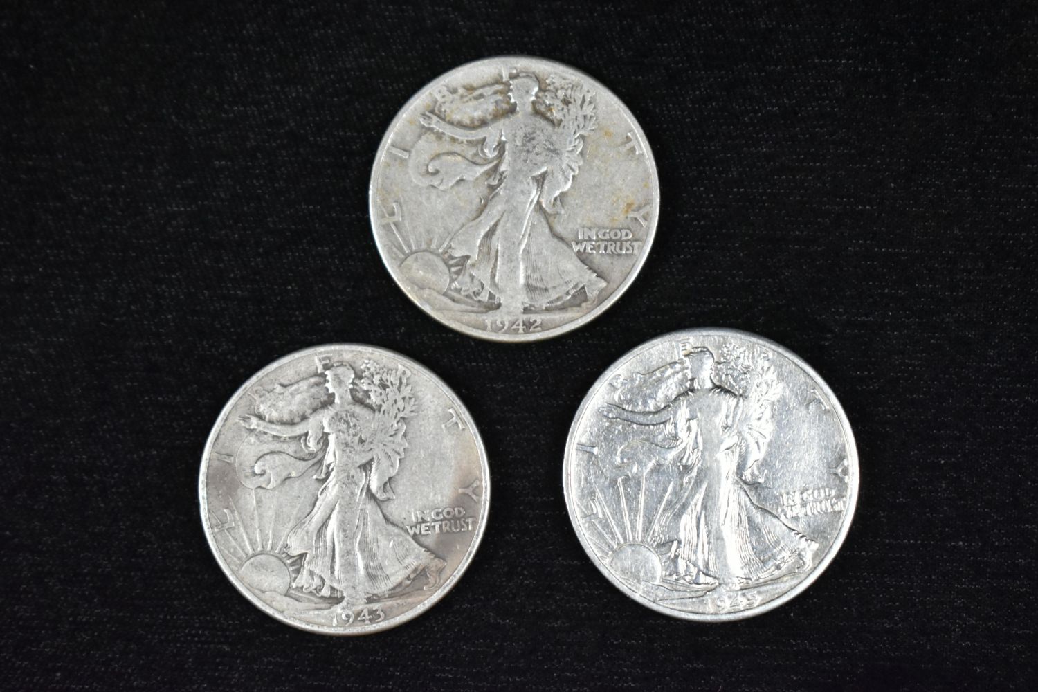 Lot of 3 Silver Walking Liberty Half Dollars, 1942, 1943, 1945