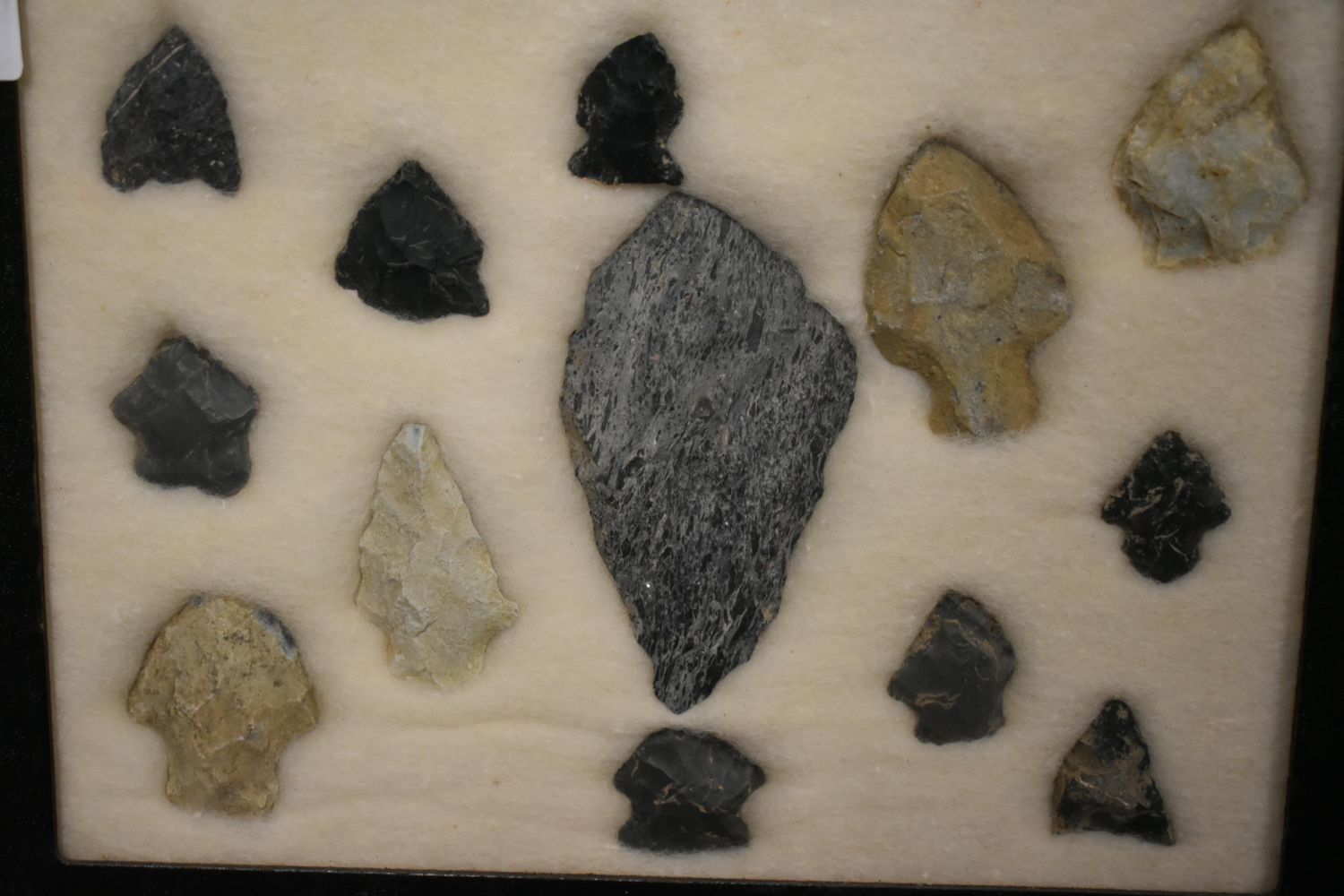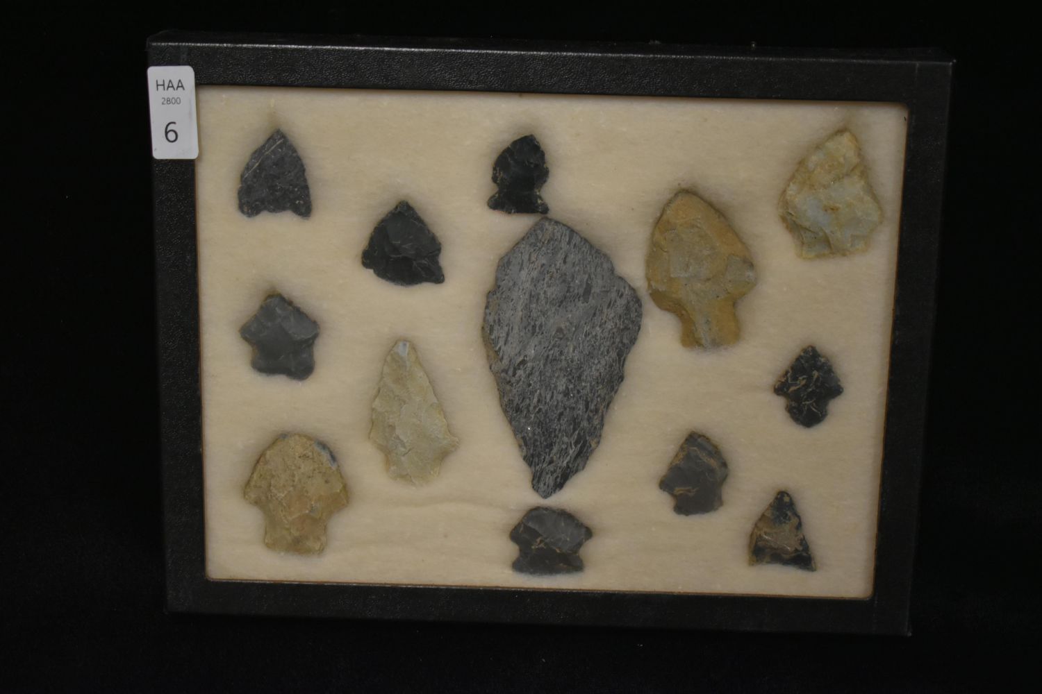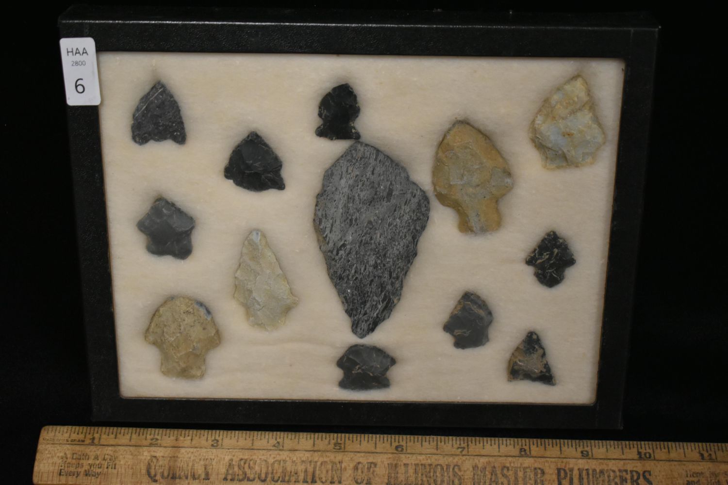 13 5/8x 6 5/8" Frame of 13 Archaic and Woodland Points, East Coast, Native American Artifacts