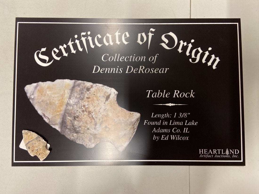 1 3/8" Table Rock Point Found in Lima Lake, Adams County IL by Ed Wilcox. Native American Artifact