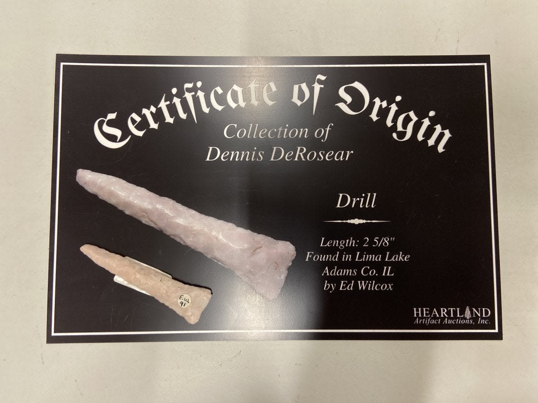 2 5/8" drill Found in Lima Lake, Adams County IL by Ed Wilcox in 1991. Native American Artifact