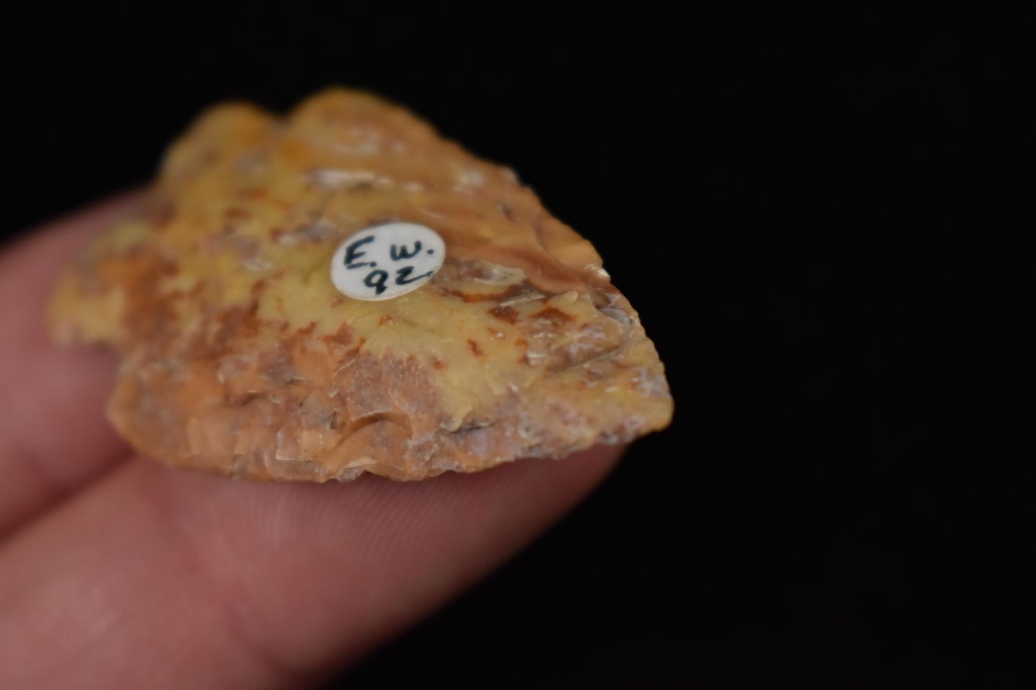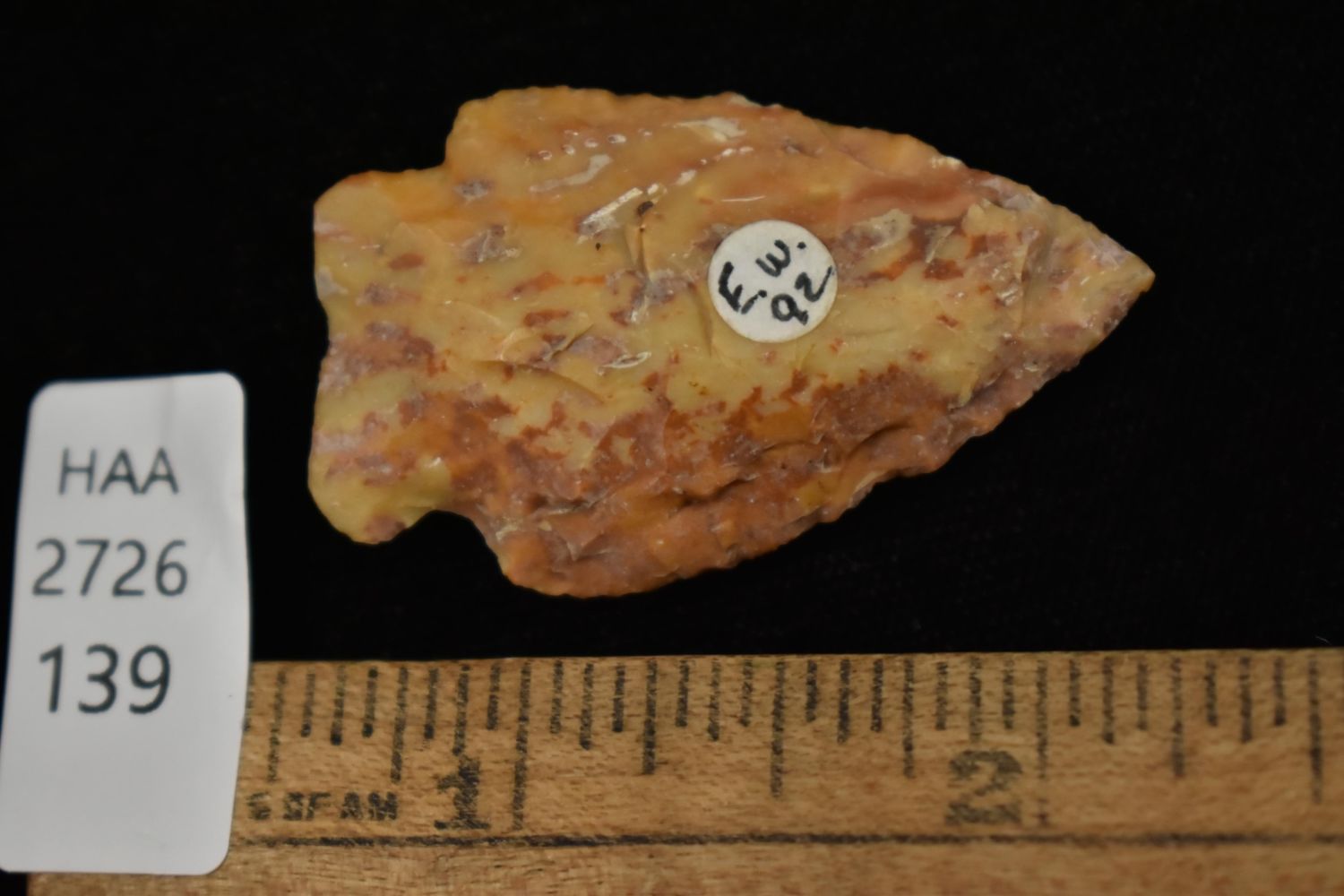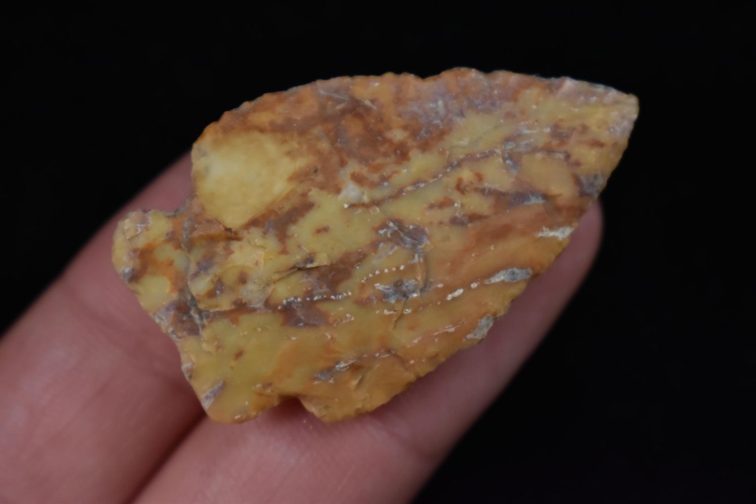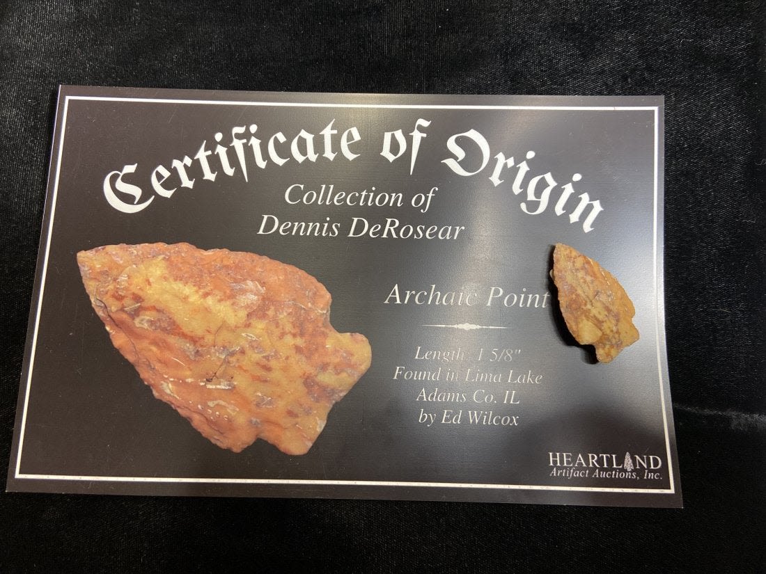 1 5/8" Archaic Point, great river stain, Found in Lima Lake, Adams County IL by Ed Wilcox. Native American Artifact