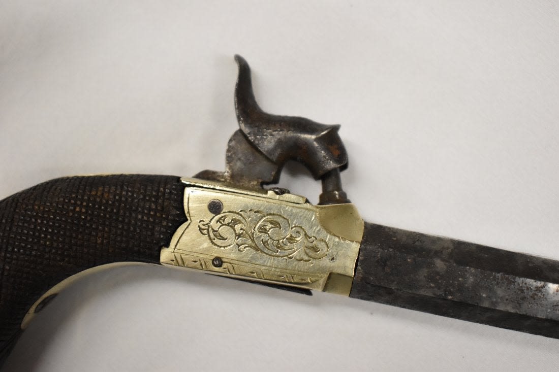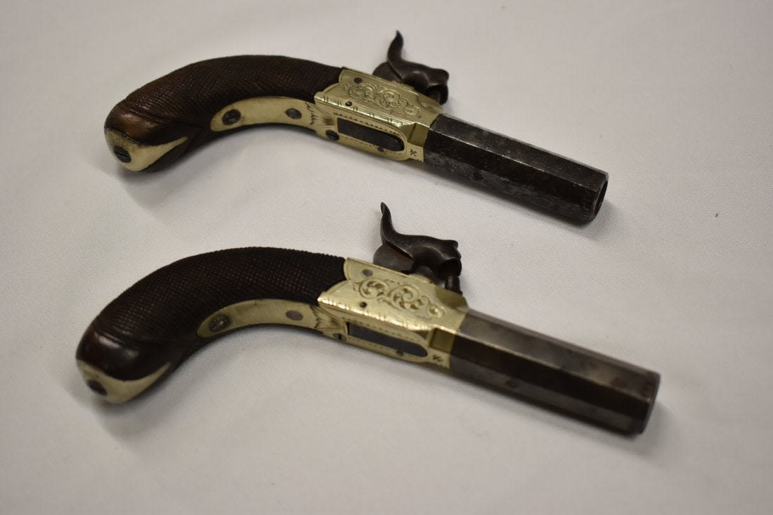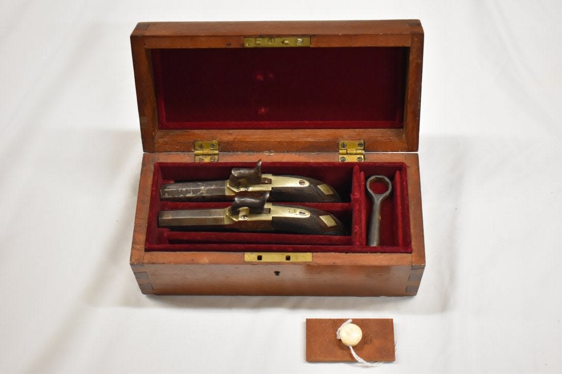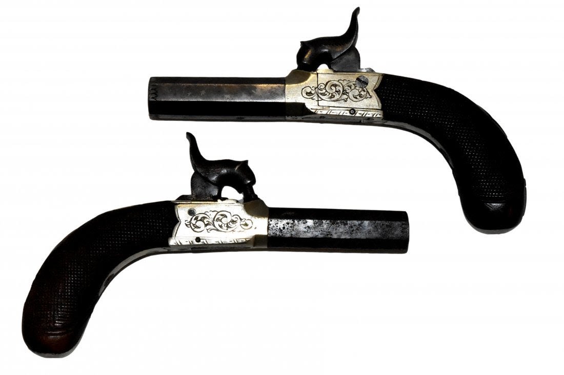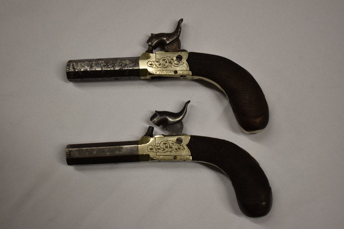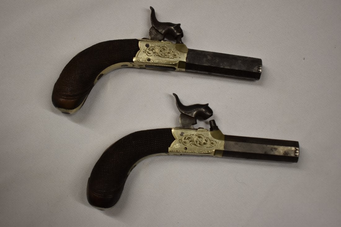Pair of Mid 1800 Mid Boxed Percussion Muff Pistols, Engraved German Silver Frame, .38 Caliber, Very Good Original Condition, Birmingham Proofed