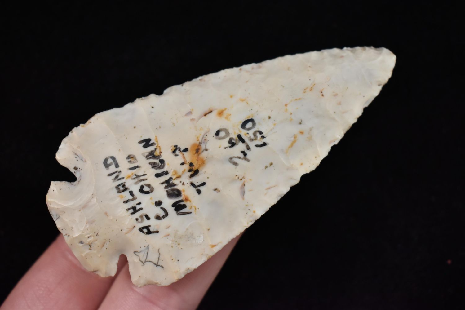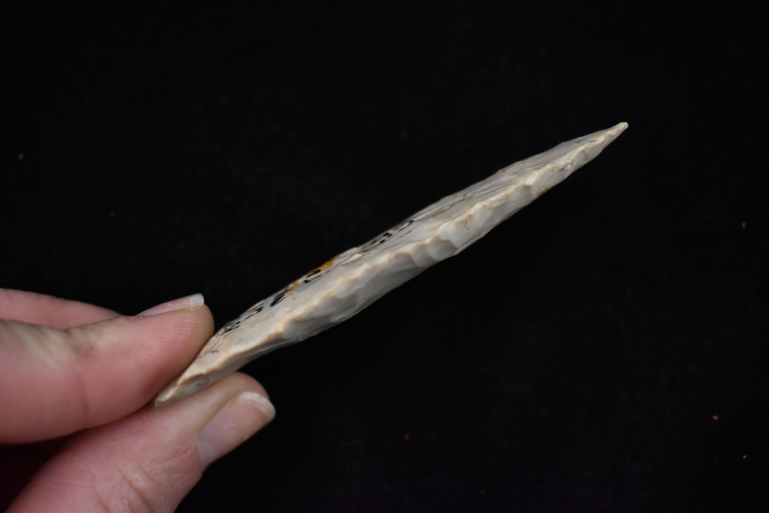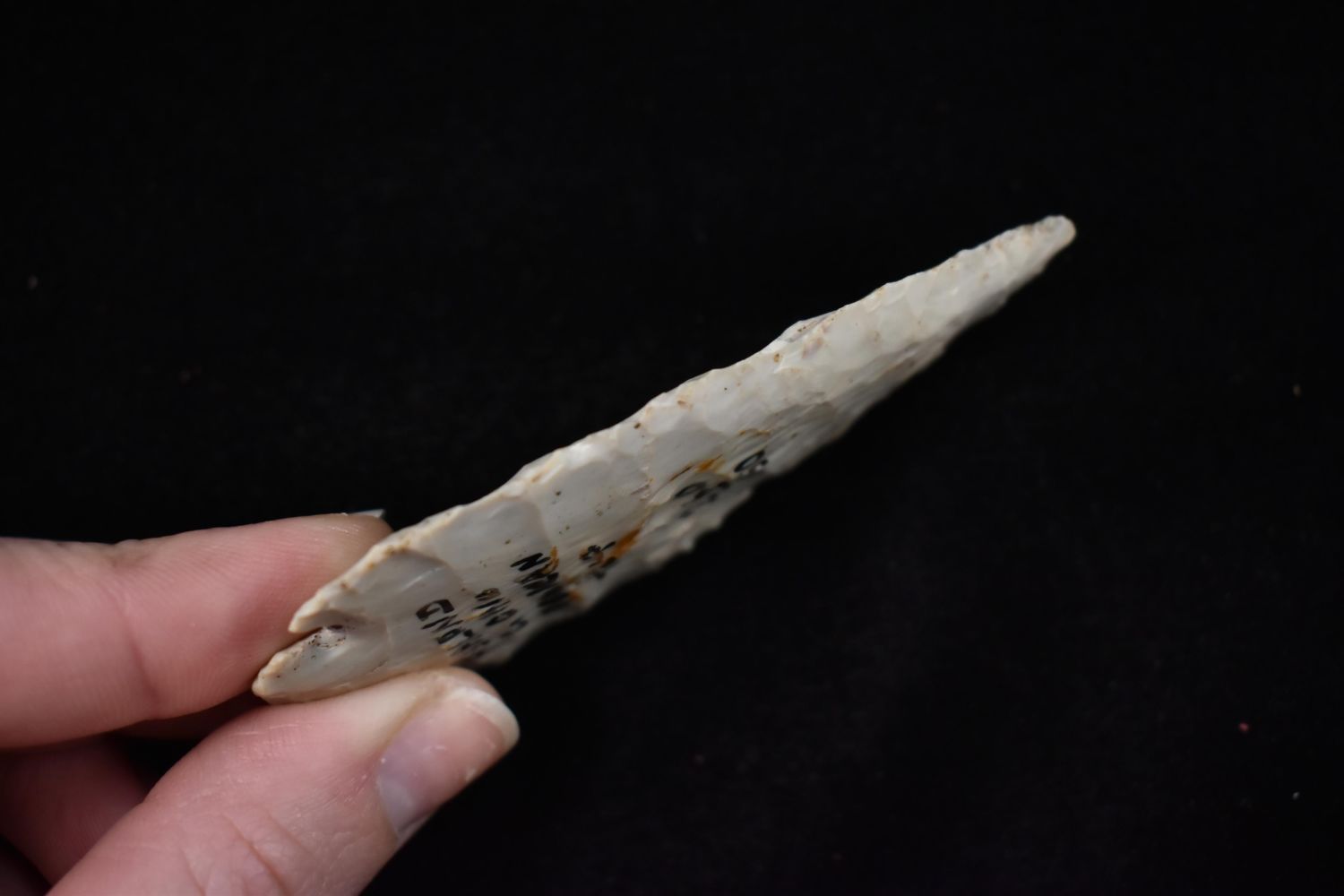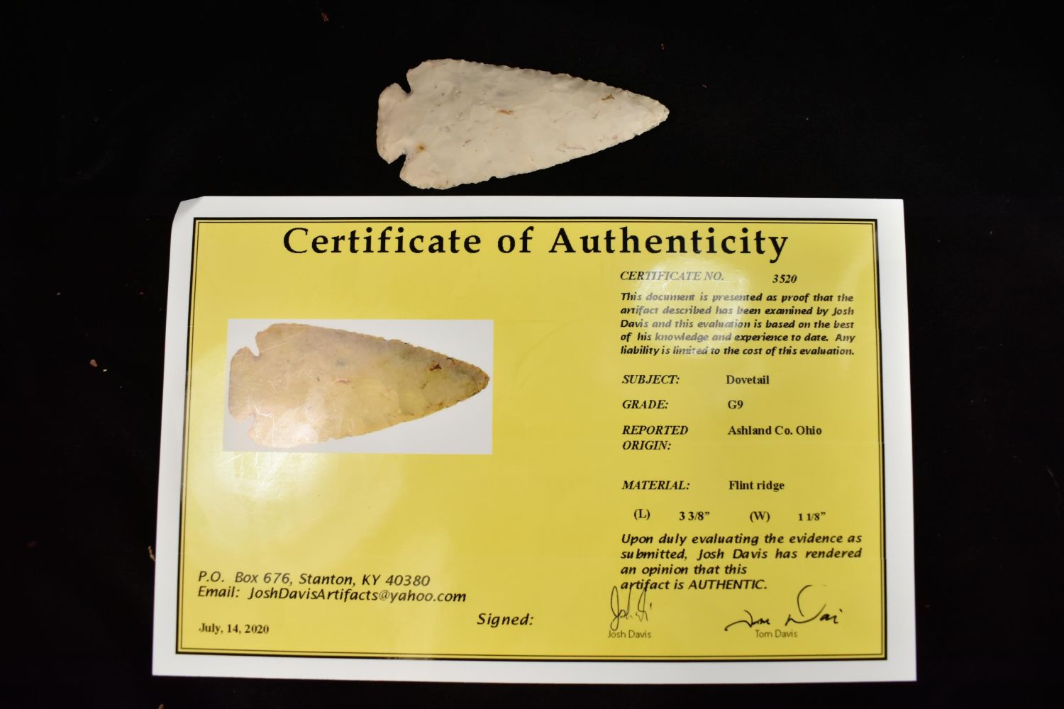 3 3/8" dovetail Point, Davis COA, Found in Ashland Co., Ohio, made of Flint ridge. Native American Artifact