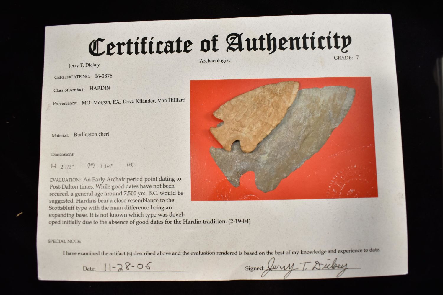 2 1/2" Hardin Point, Dickey COA, Found in Morgan Co., Missouri. EX Dave Kilander, Von Hilliard. Native American Artifact