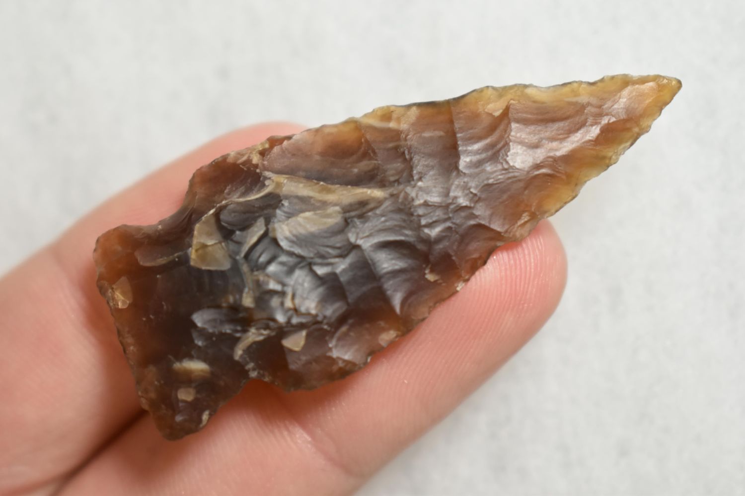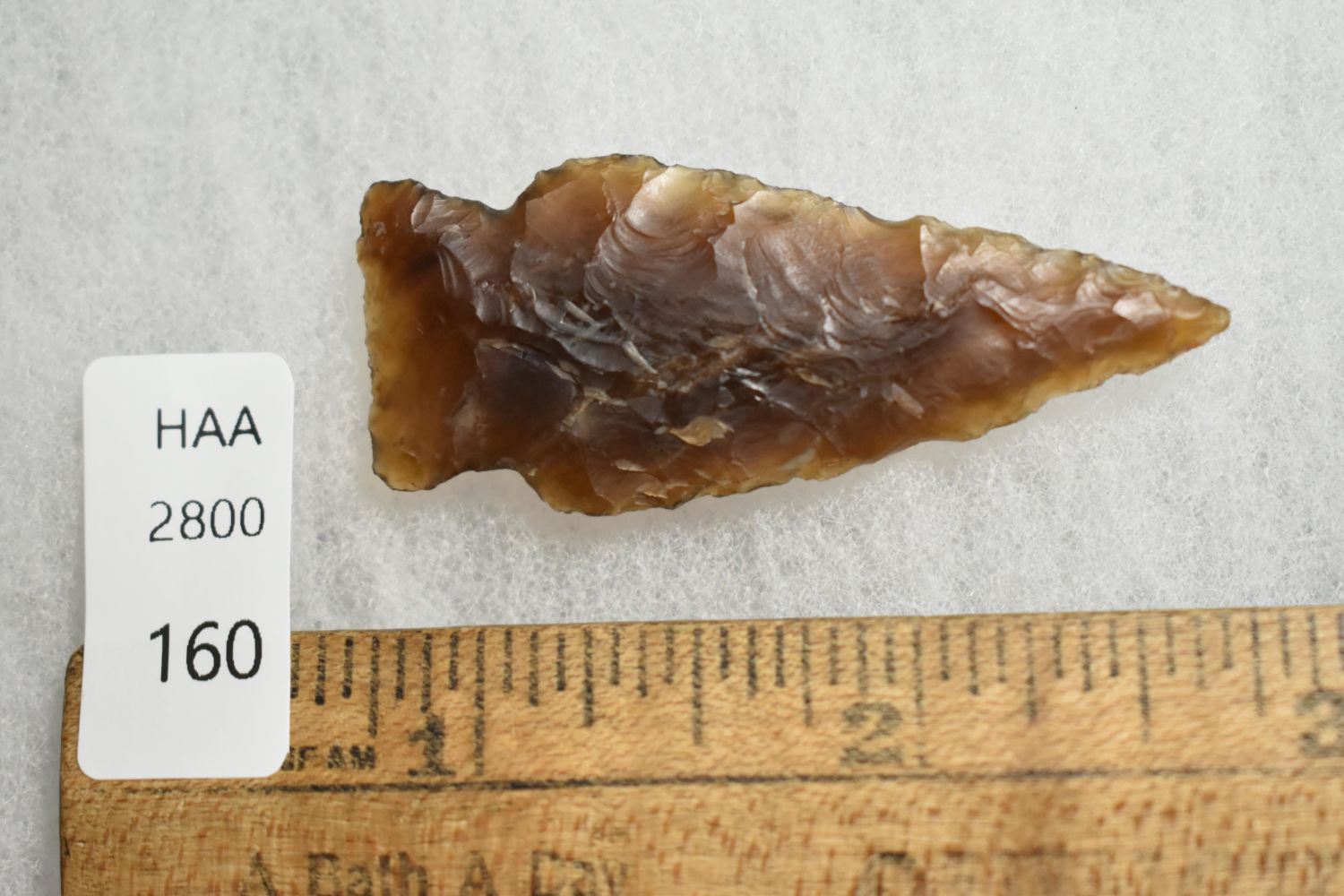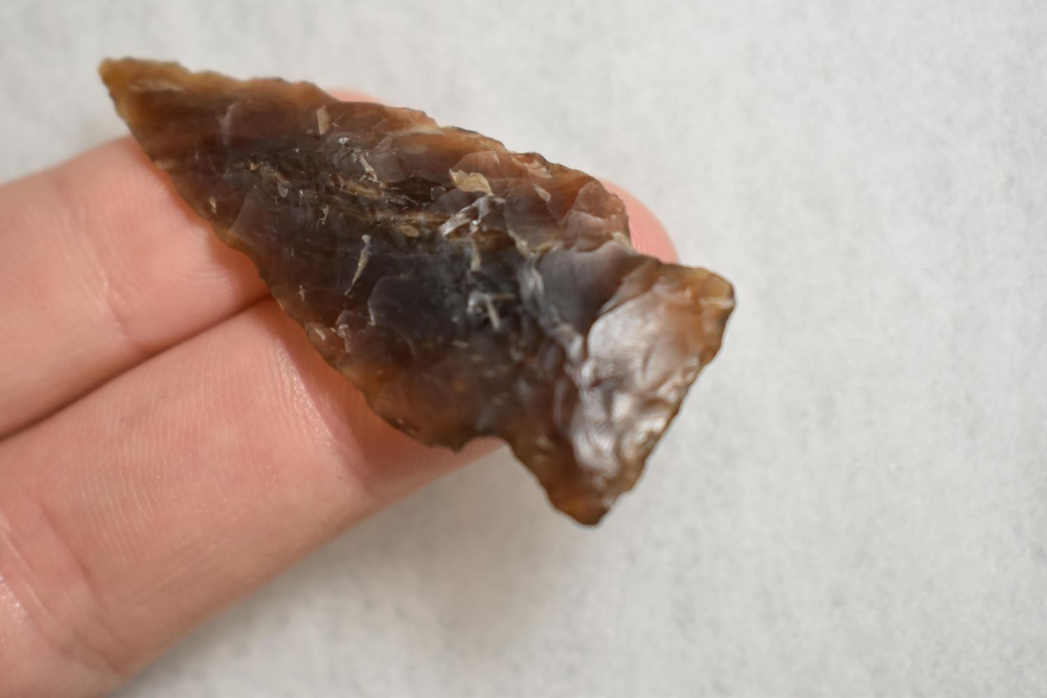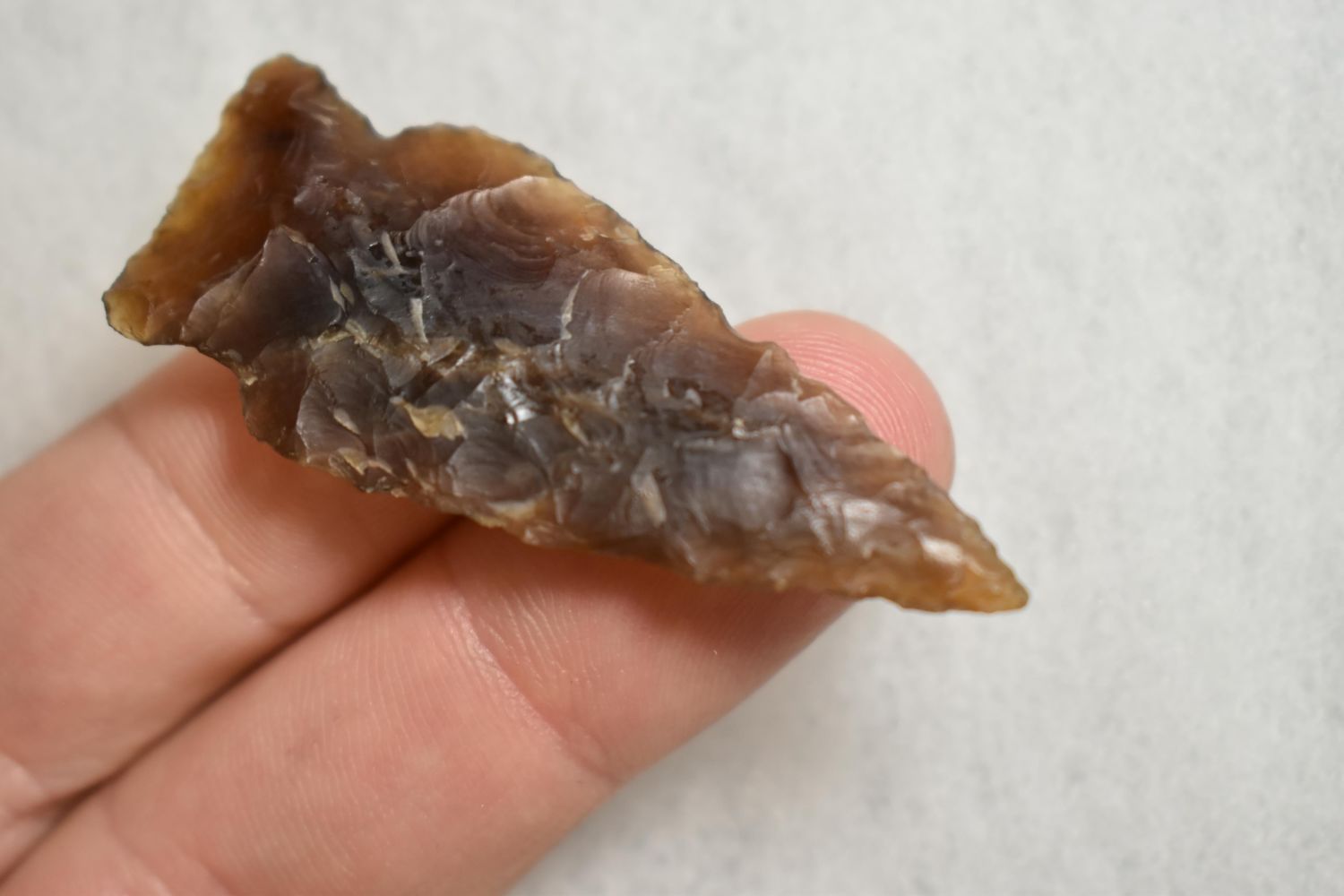 2" bullhead Point, made of knife river. EX Robert Walter. Native American Artifact
