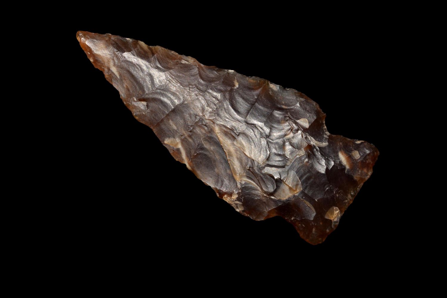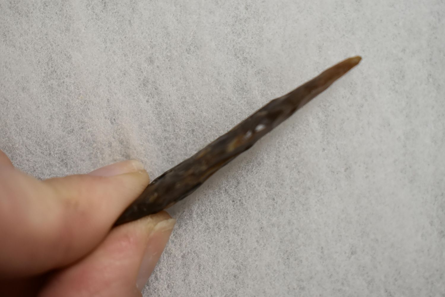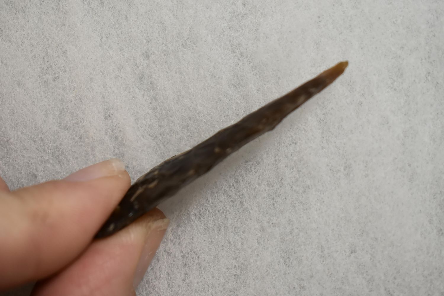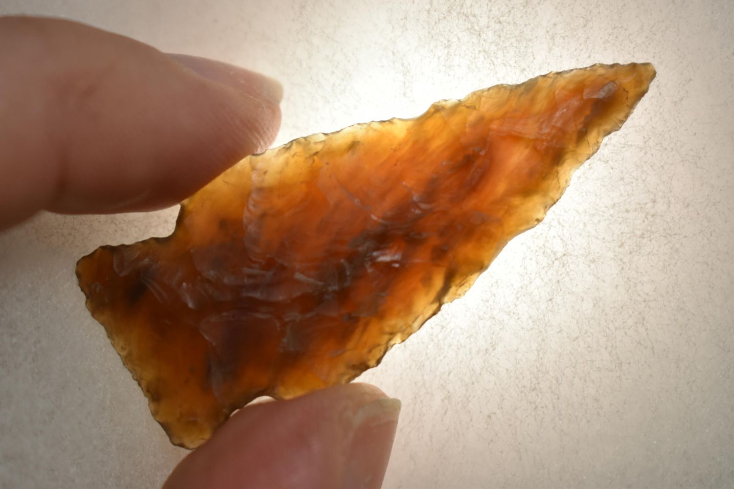 2" bullhead Point, made of knife river. EX Robert Walter. Native American Artifact