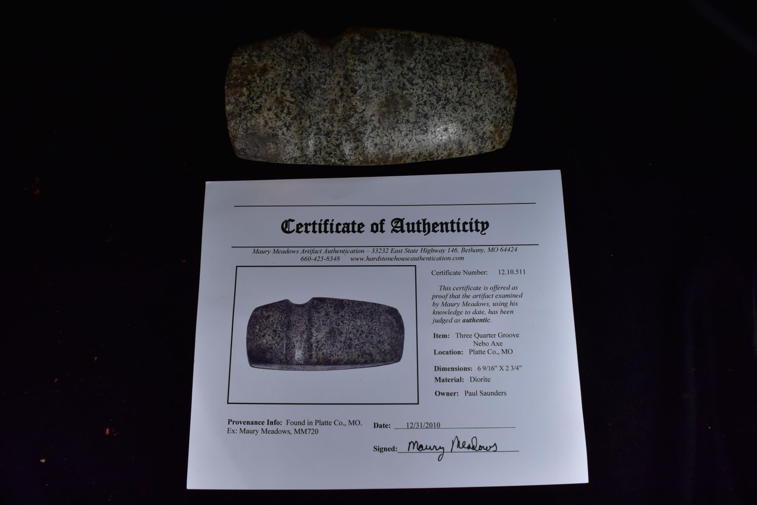 6 9/16" 3/4 Grooved Axe, Meadows COA, Found in Platte Co., Missouri. Native American Artifact