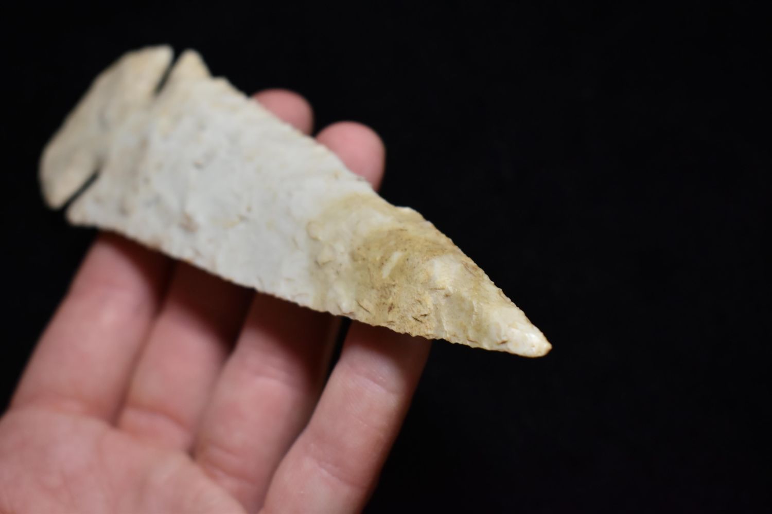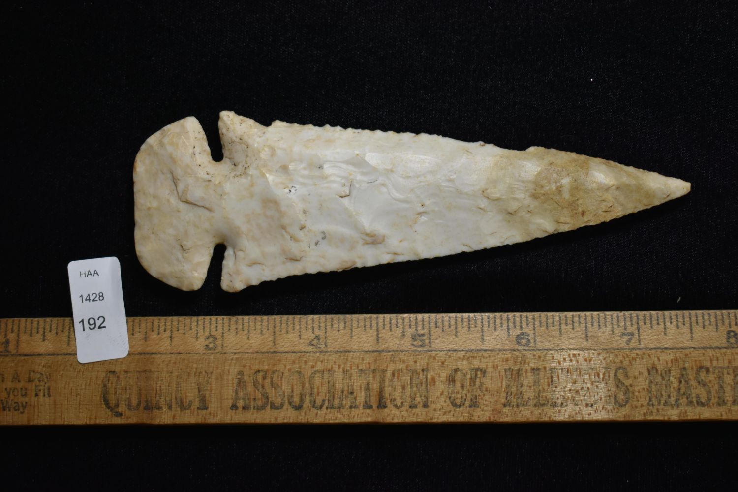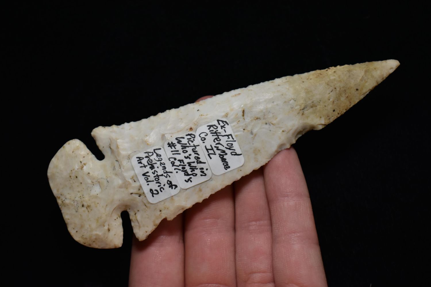 5 3/8" dovetail Point. Found in Monroe Co., Illinois. EX Frankie collection, Floyd Ritter. Pictured in Who’s Who #11 and Legends of Prehistoric Art Vol. 2. Also pictured on page 43 of Prehistoric Art under Frankie Collection. Native American Artifact