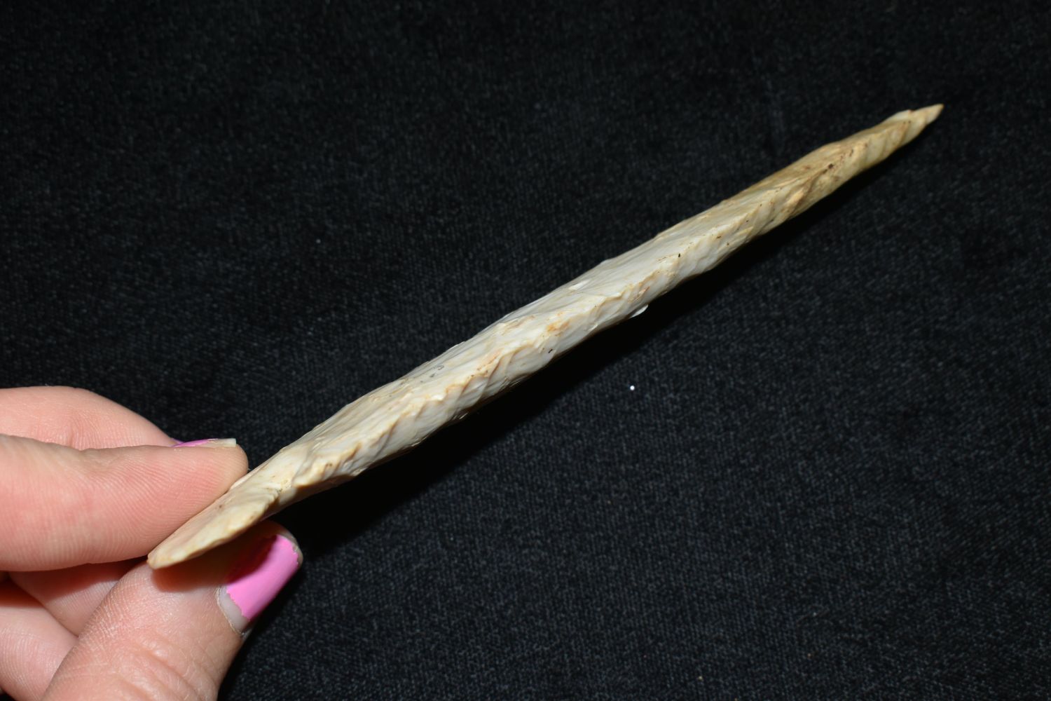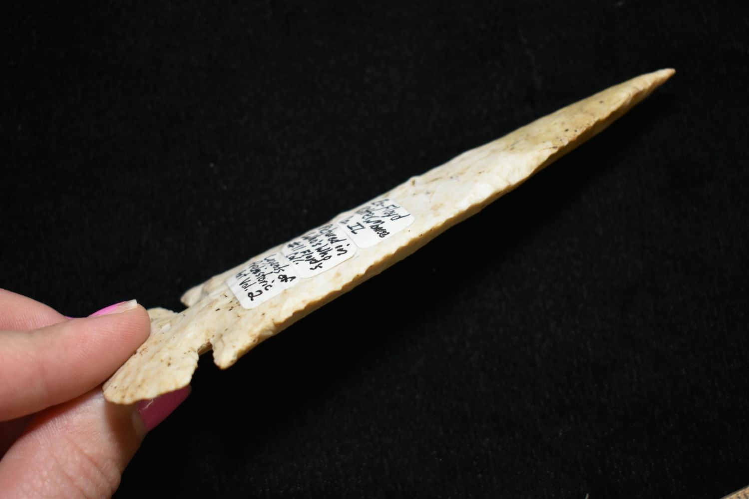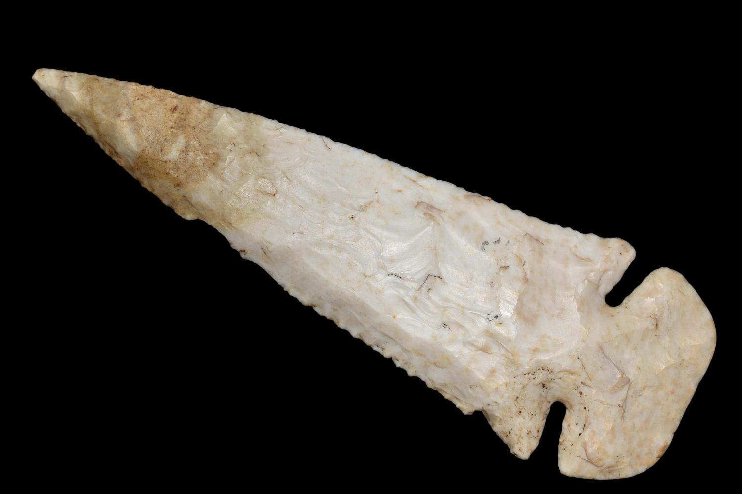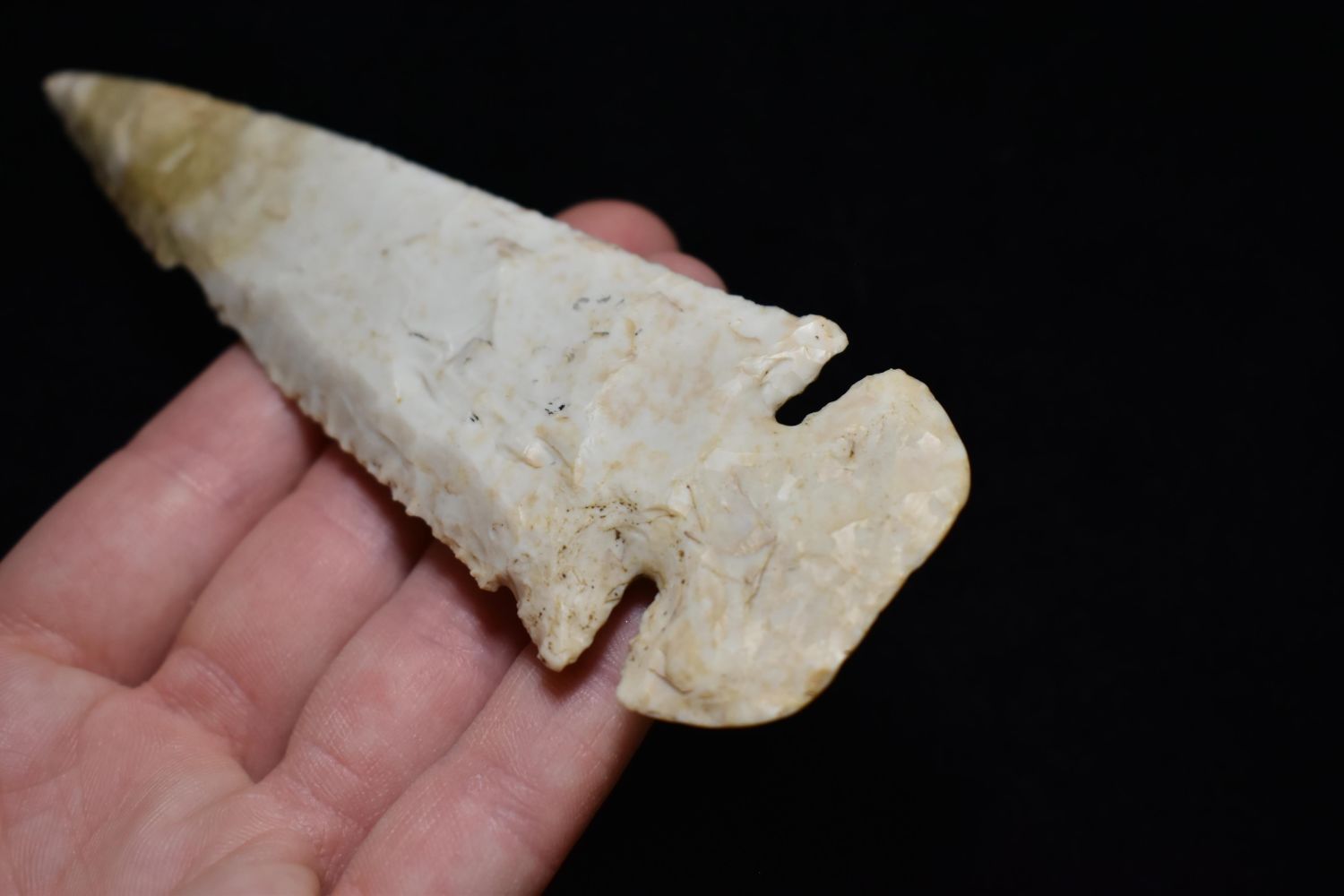 5 3/8" dovetail Point. Found in Monroe Co., Illinois. EX Frankie collection, Floyd Ritter. Pictured in Who’s Who #11 and Legends of Prehistoric Art Vol. 2. Also pictured on page 43 of Prehistoric Art under Frankie Collection. Native American Artifact