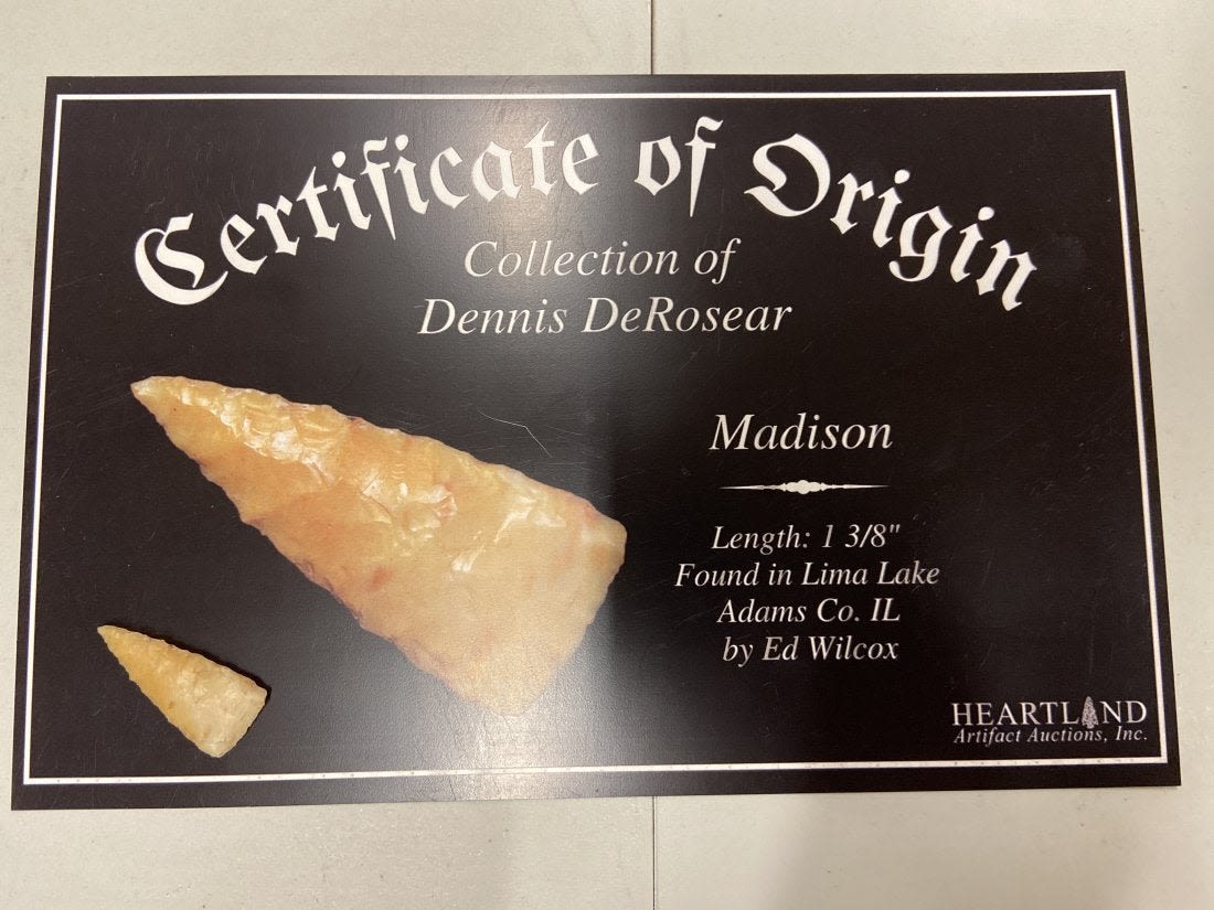 1 3/8" Madison Point Found in Lima Lake, Adams County IL by Ed Wilcox in 1999. Native American Artifact