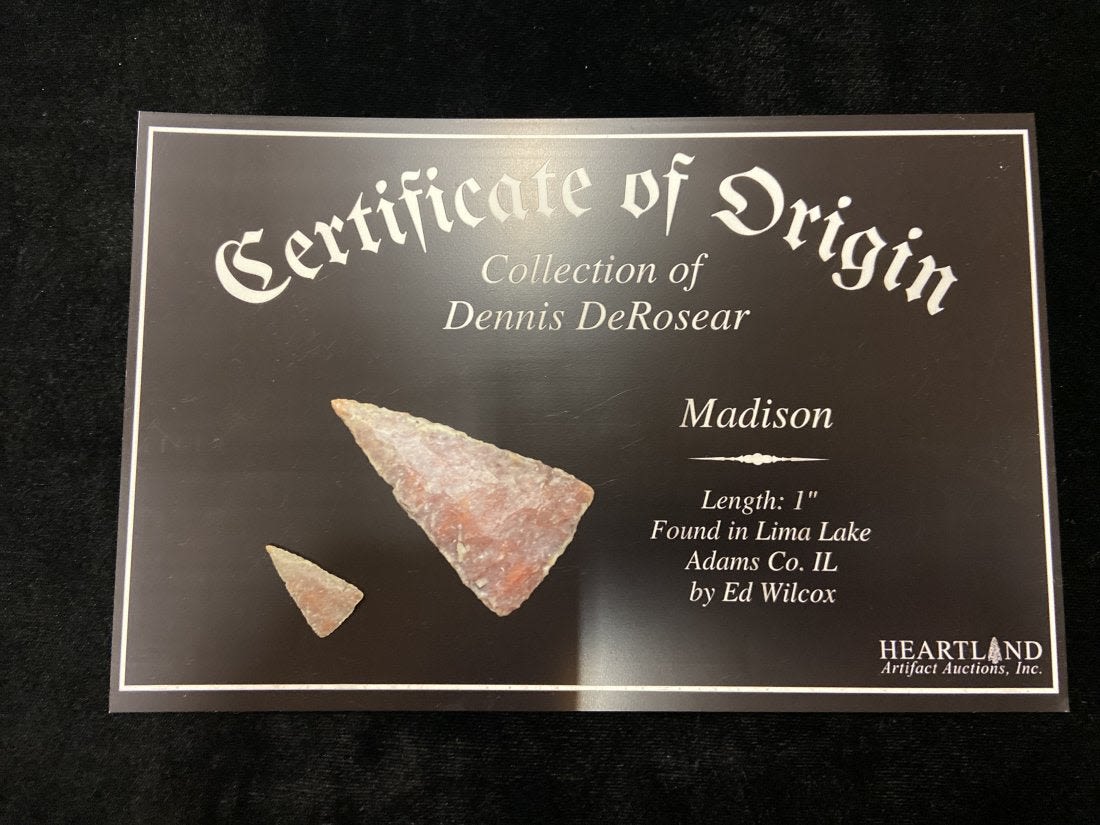 1" Madison Point Found in Lima Lake, Adams County IL by Ed Wilcox. Native American Artifact