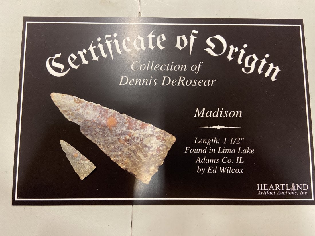 1 1/4" Madison Point Found in Lima Lake, Adams County IL by Ed Wilcox in 2012. Native American Artifact