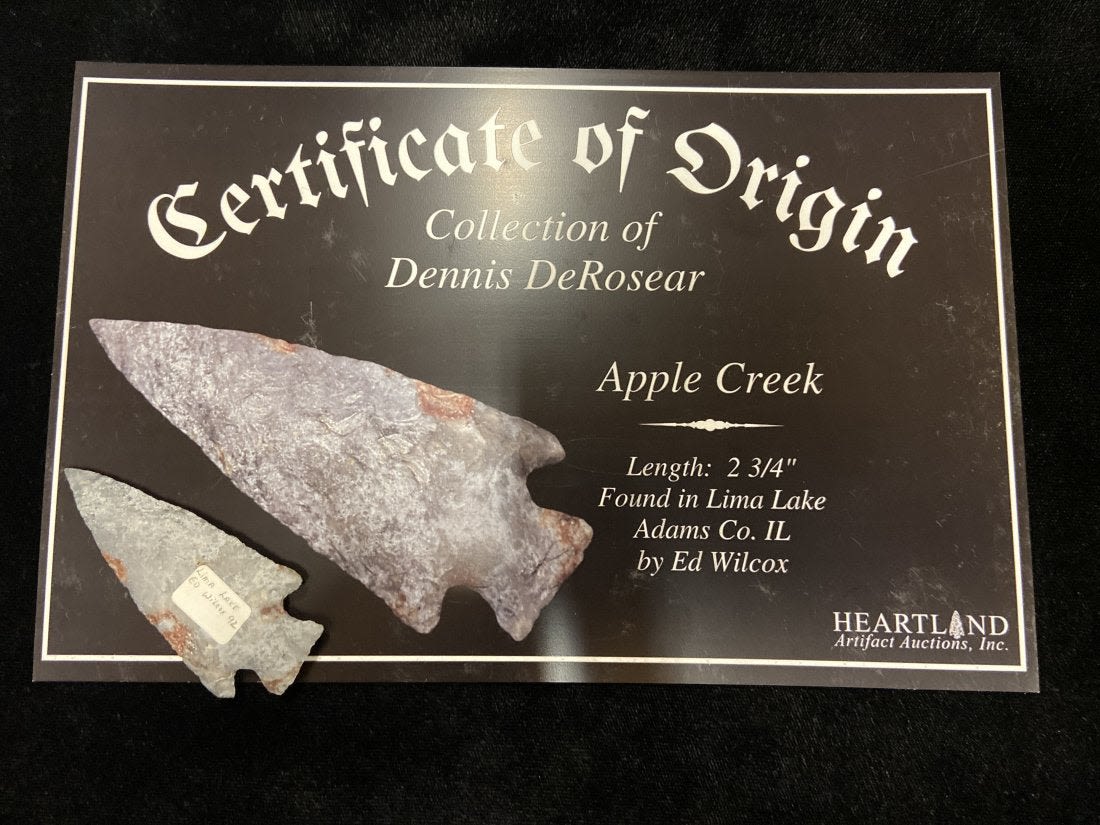 2 3/4" Apple Creek Point Found in Lima Lake, Adams County IL by Ed Wilcox in 1992. Native American Artifact