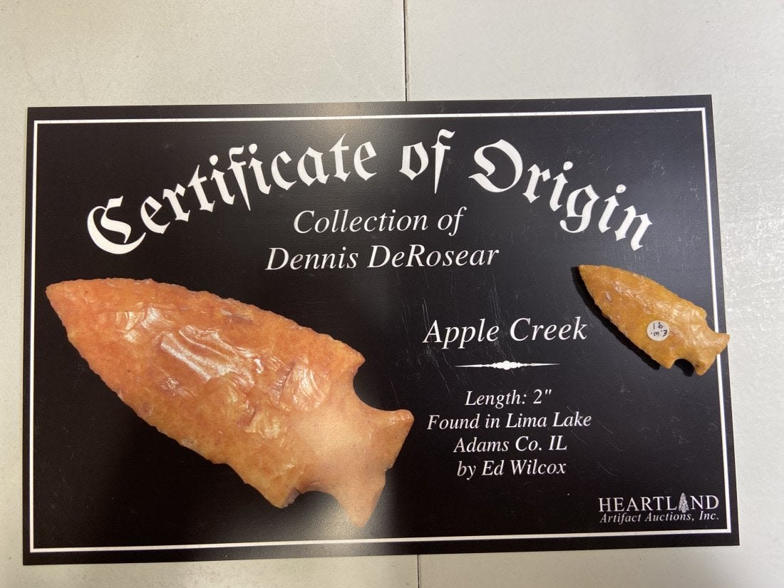 2" Apple Creek Point Found in Lima Lake, Adams County IL by Ed Wilcox in 1991. Native American Artifact