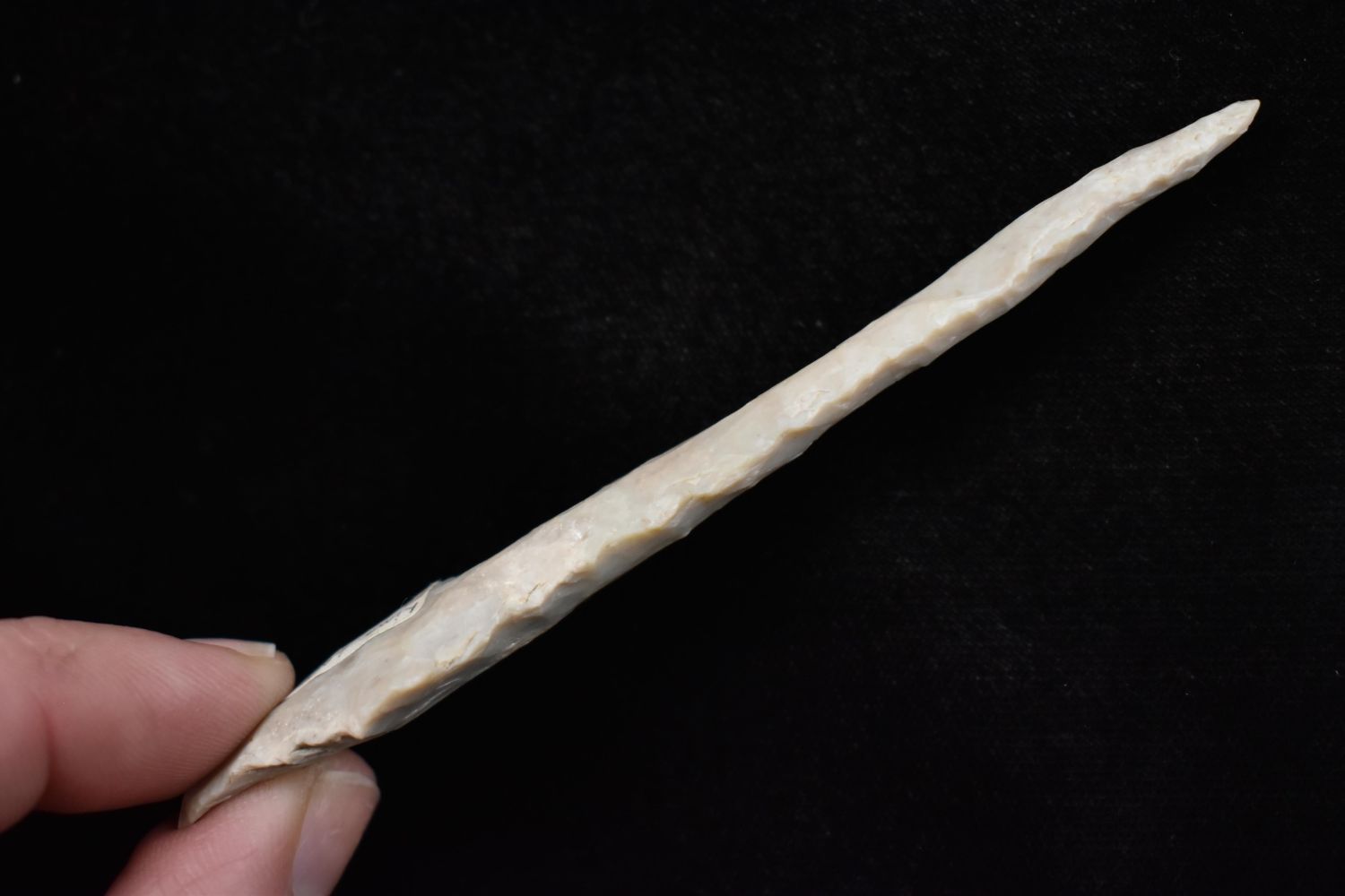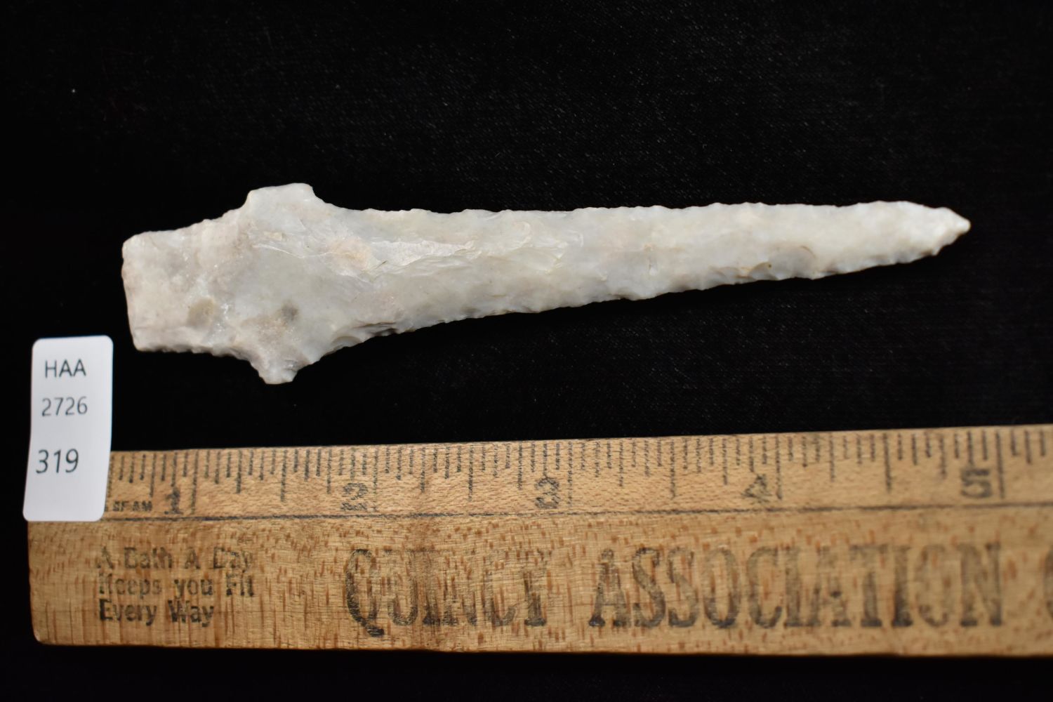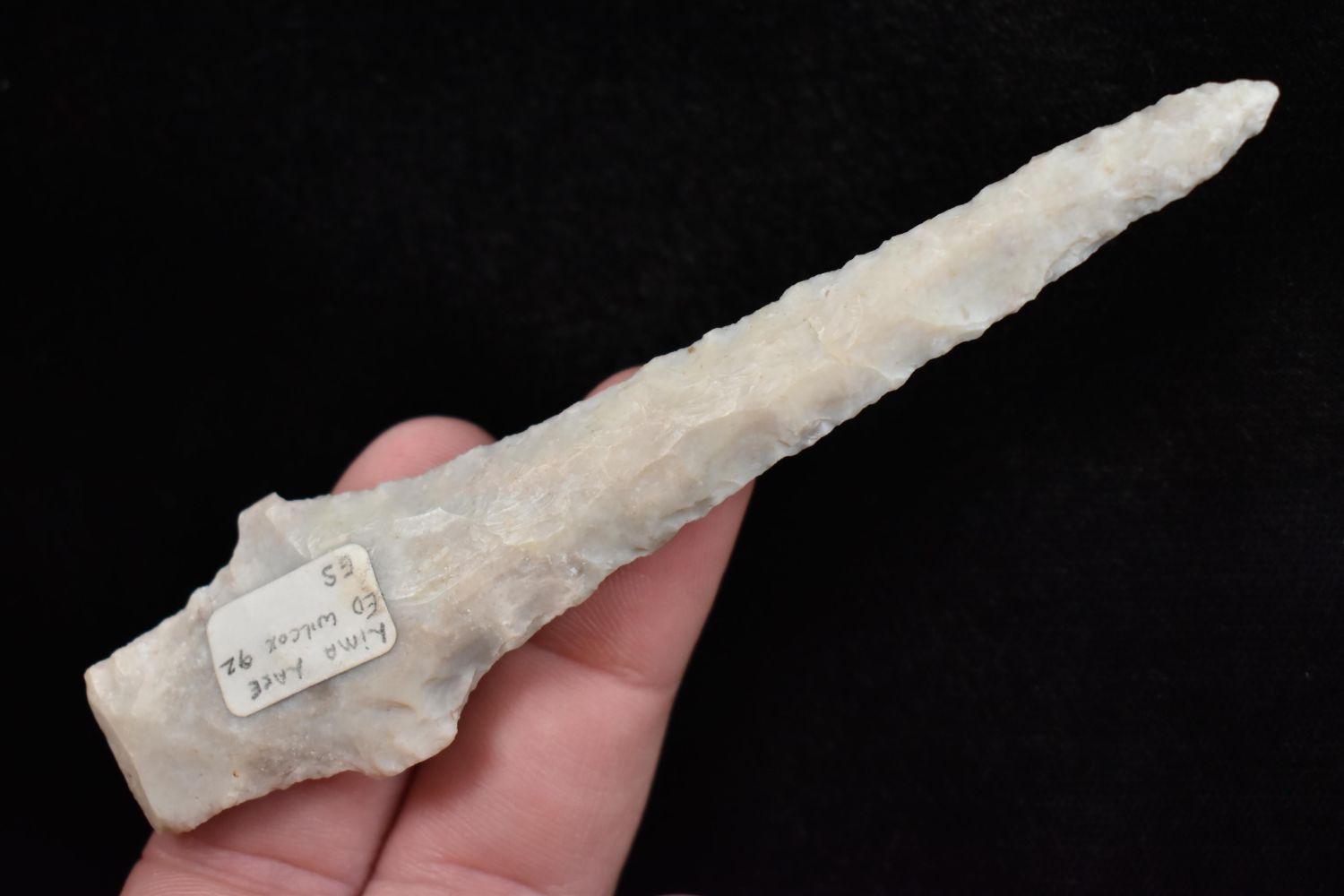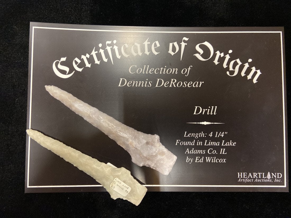 4 1/4" drill, broken and reglued, Found in Lima Lake, Adams County IL by Ed Wilcox in 1992. Native American Artifact