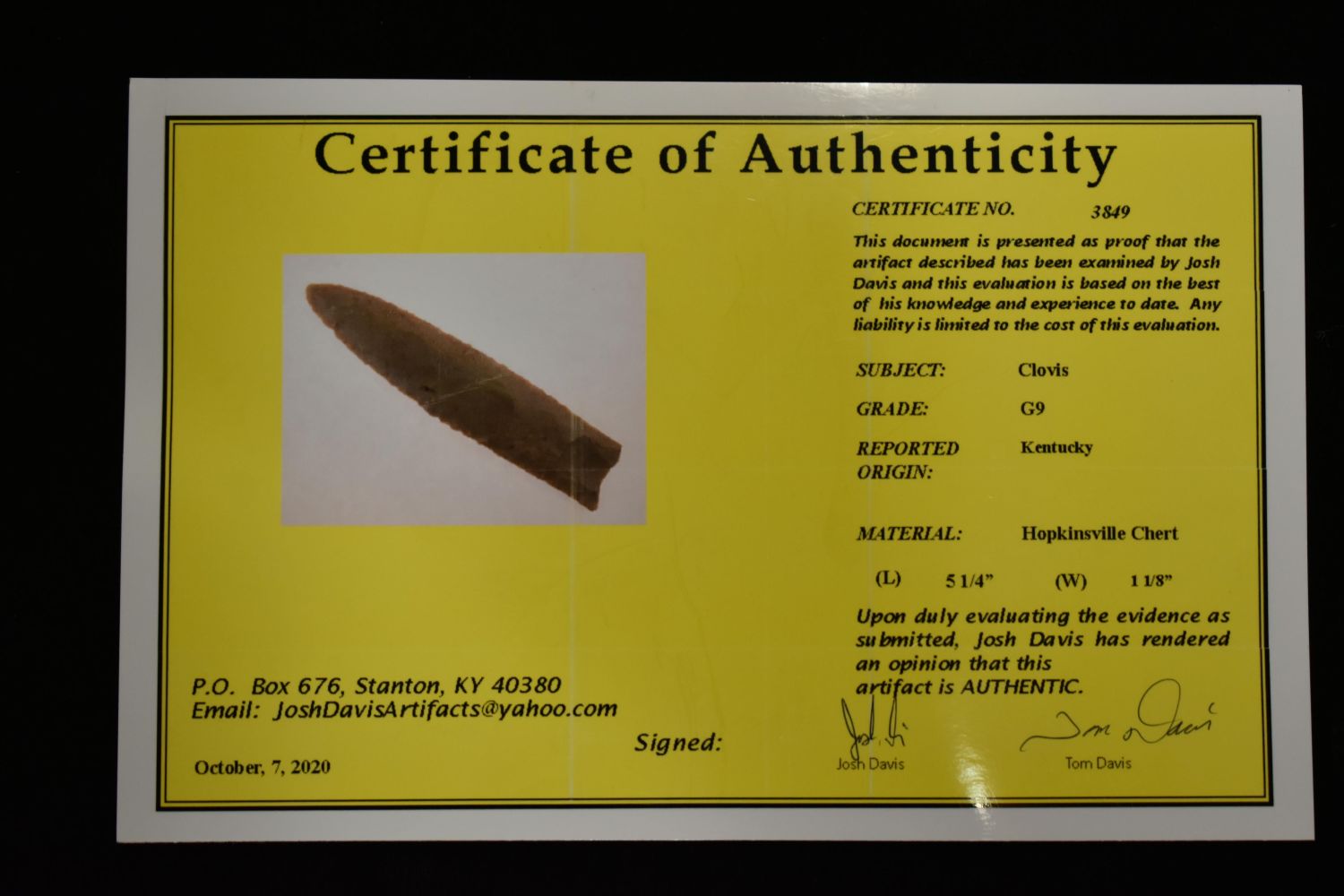 Outstanding 5 1/4" Clovis, Davis COA, found in Kentucky