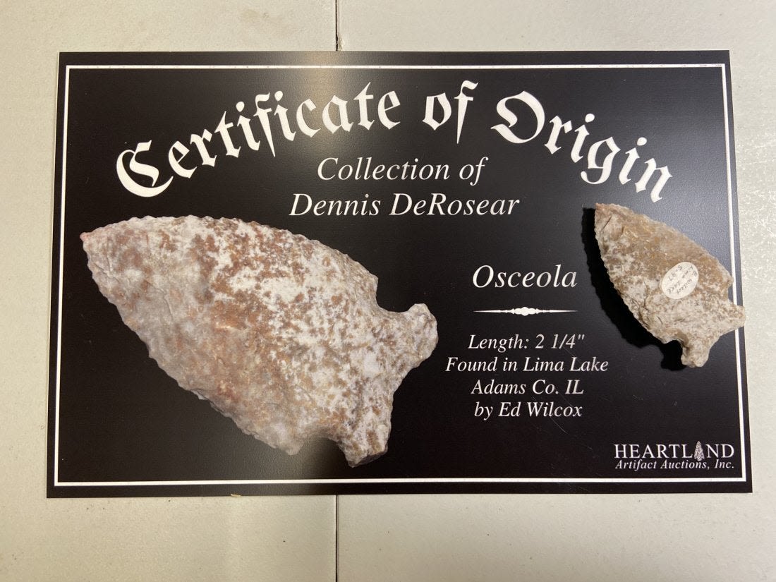 2 1/4" Osceola Point Found in Lima Lake, Adams County IL by Ed Wilcox in 1997. Native American Artifact