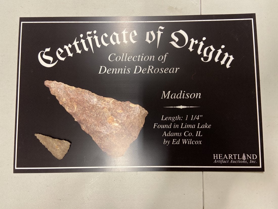 1 1/4" Madison Point Found in Lima Lake, Adams County IL by Ed Wilcox in 2012. Native American Artifact