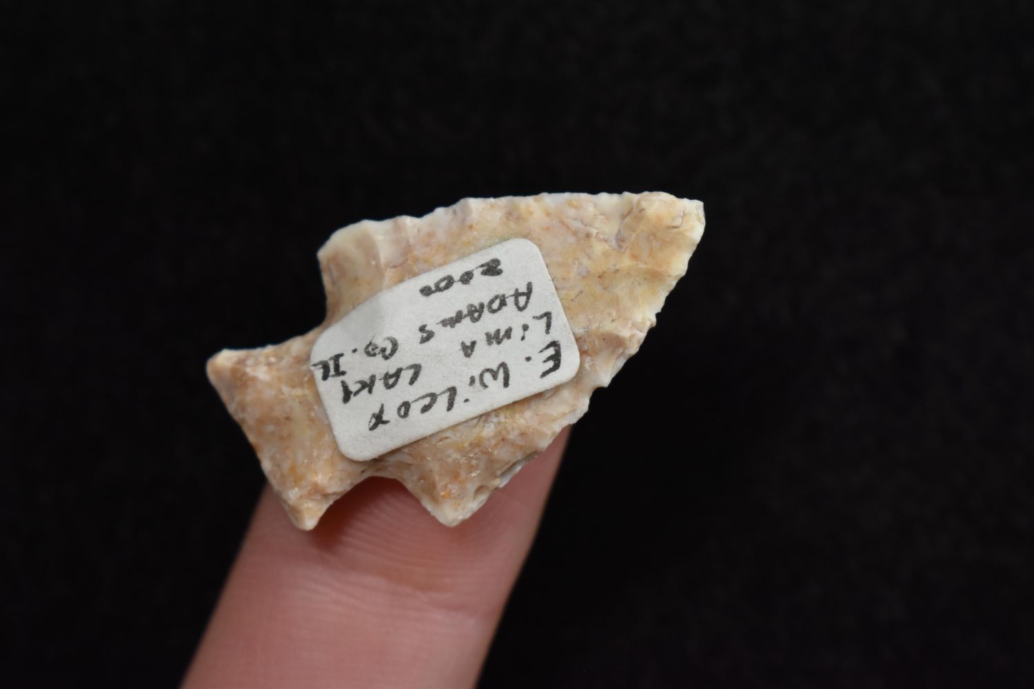 1 1/4" Bird Point Found in Lima Lake, Adams County IL by Ed Wilcox in 2000. Native American Artifact